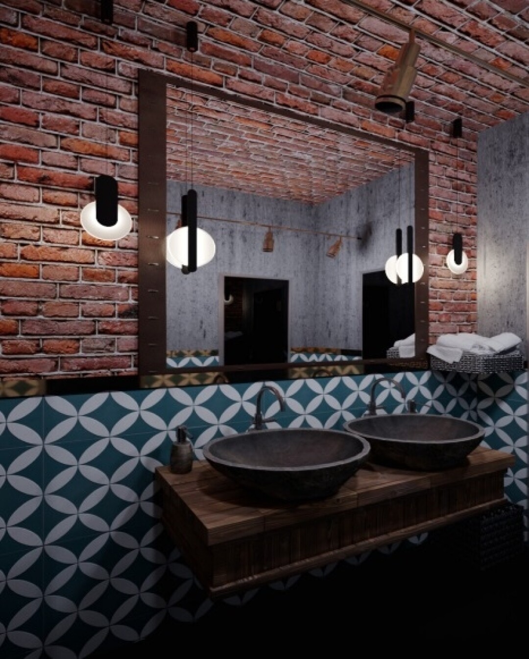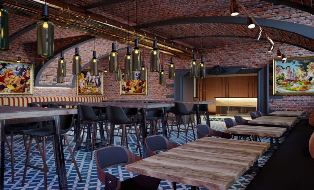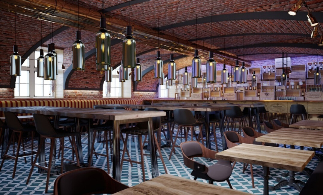 Стены, своды и потолок бара, напоминающие старинный погреб, сделаны из красного кирпича, плафоны светильников декорированы плавлеными бутылками.