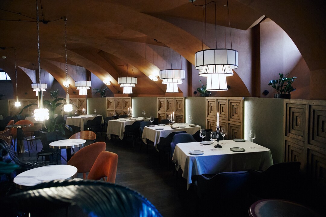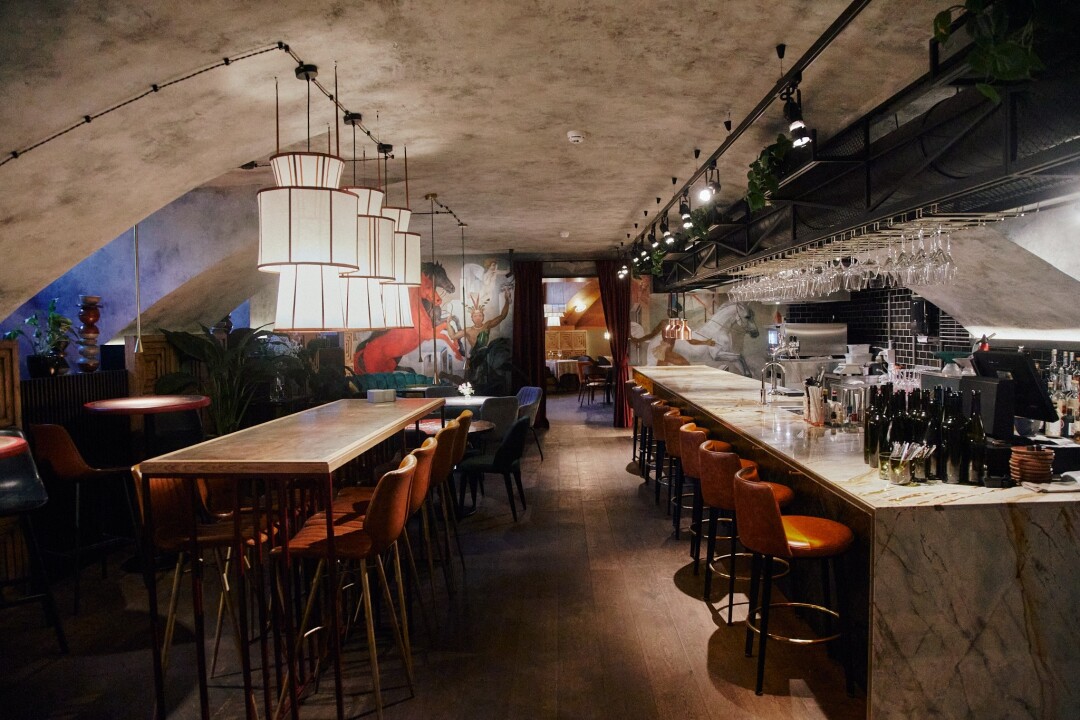 Помещение с анфиладой сводчатых залов оформляла Кира Гришина, автор интерьера любимого книжного «Подписные издания». Свежие цветы и зеленые растения, приглушенный свет и свечи, белые скатерти и бархатная мебель мягких оттенков – в ресторане хочется задержаться. Во всех трех пространствах разное настроение: дальнее – спокойное, с длинным общим столом, второе – со сценой – для концертов и шумных встреч, и первое с открытой кухней, за работой на которой можно наблюдать, усевшись за стойку. О том, что это винный проект сразу подскажет стеклянная комната со 130 этикетками, расположенная ровно напротив входа.