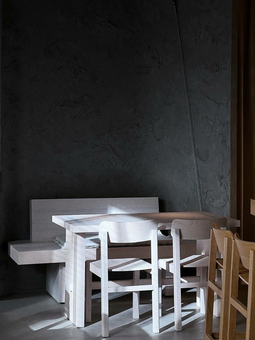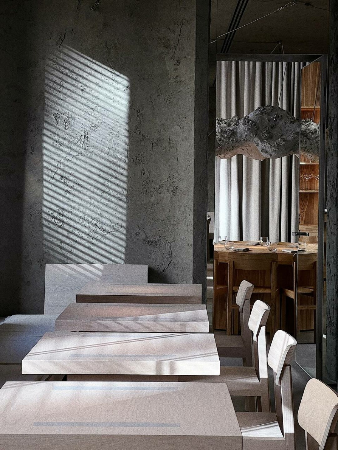 К оформлению Porto 19 подключилось уже родное Бердиевам архитектурное бюро DA Bureau и его главнокомандующий Борис Львовский, который до этого разрабатывал интерьеры Birch и Osteria Betulla. Свое отношение к морю здесь подчеркнули совершенно нежным образом: серые стены и поверхности столов, косплеящие водную гладь, огромные гипсокартонные светильники-кораллы (второй висит в секретном кабинете за зеркалом на 10 человек), тросы, веревки и морские крюки. Прямо в центре зала поставили устричный бар, за стойкой которого на высоких стульях могут сидеть гости.