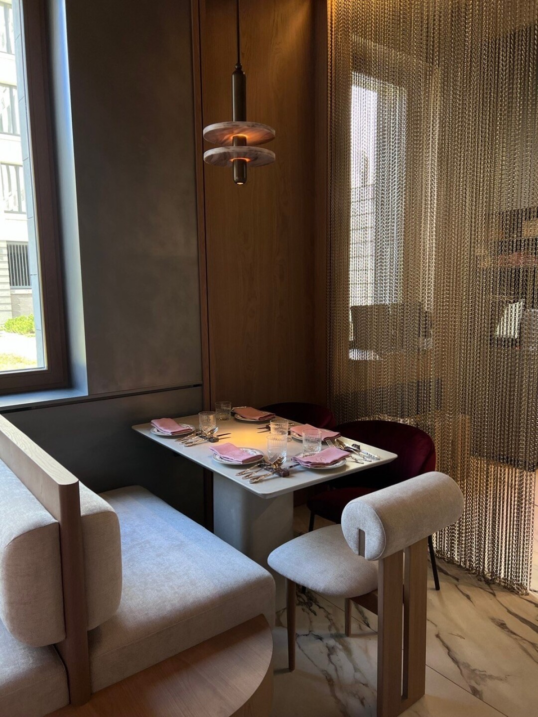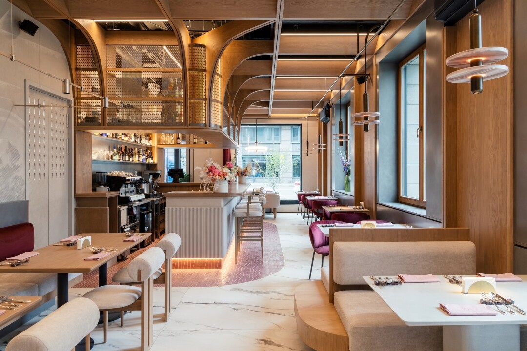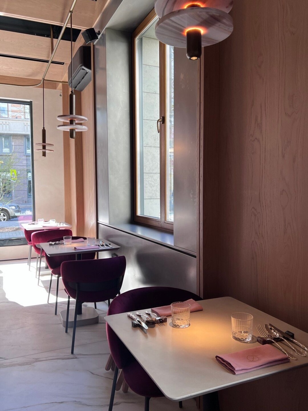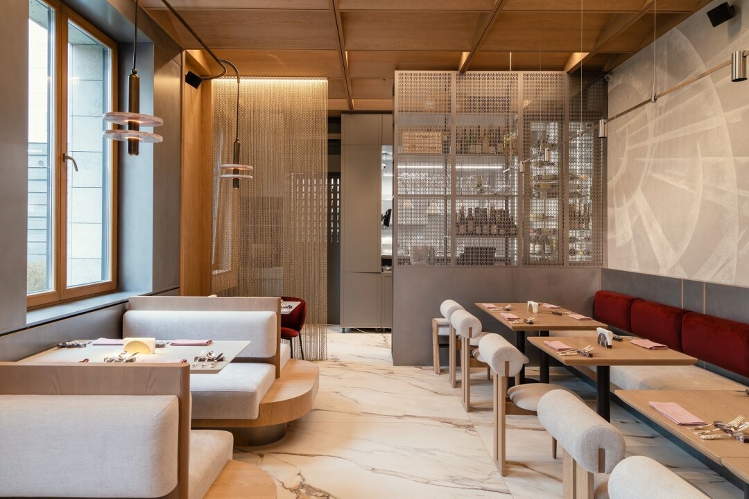 Тут же спокойный дизайн не призывает к лишней торжественности. В меру нарядно выглядит сочетание холодного бетона, нескольких оттенков дерева, ретро-футуристичных светильников и больших окон (а сторона довольно солнечная!). Скорее всего, вы обратите внимание на красный мрамор подставок под приборы и тарелки, с нанесенным по спецзаказу рисунком. Команда любит рассказывать про орнамент, повторяющий кружевной узор решеток Михайловского сада и росписи Кварнеги с лоджии Рафаэля в Эрмитаже.