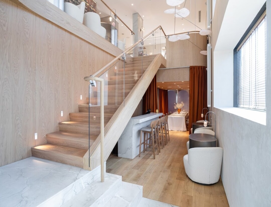 На второй этаж, где растут живые оливы, ведет лестница с палубной подсветкой. Окна пространства закрыты реечными шторами, через которые свет очень графично и фотогенично падает на стены. Отсюда открывается вид на закат, но лучшее место для визуальной медитации— большая летняя терраса, вписанная в неоклассическую архитектуру элитного ЖК. В этом цветущем саду, где также расставлены веранды европейского Saro и Frantsuza Bistro, можно бесконечно смотреть на залитую солнцем Малую Невку, Лазаревский мост и проезжающие мимо яхты.