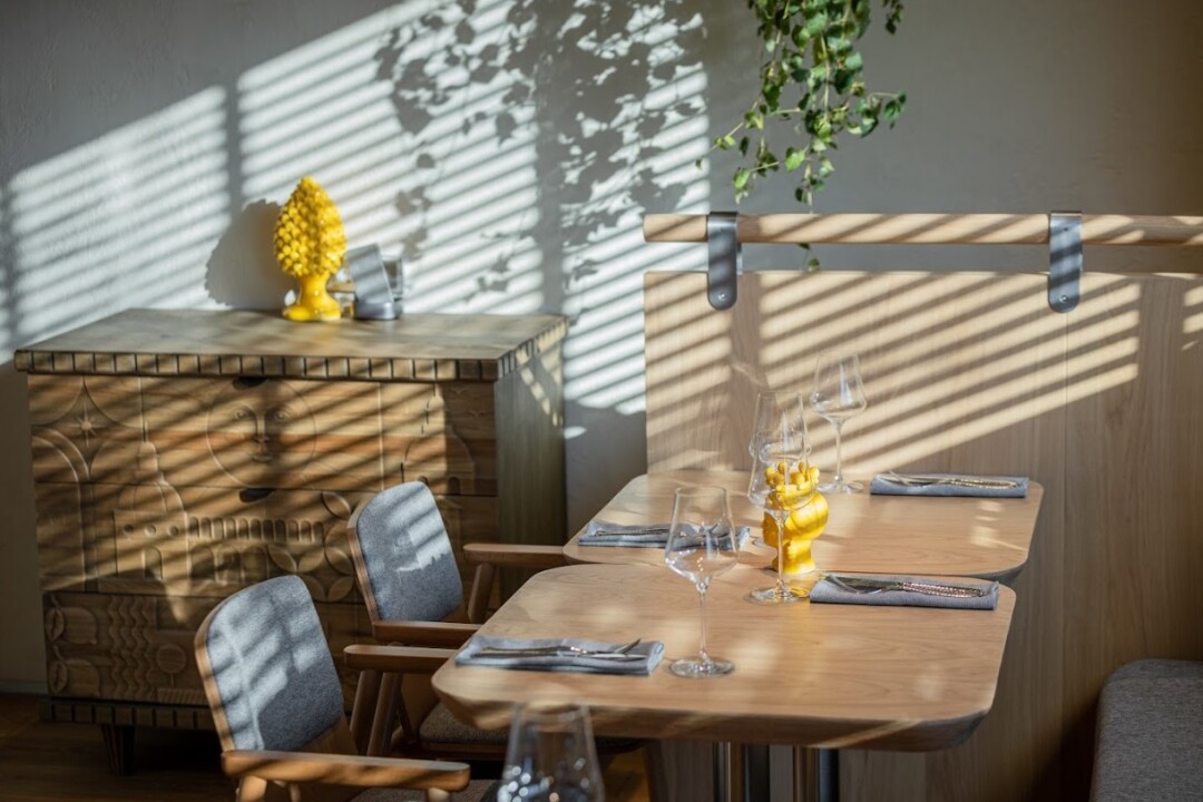 Ресторан Noto назвали в честь одноименного города на Сицилии (из его руинных камней сделаны таблички резерва!). Об острове нам тут же напоминает керамика, расставленная на столах. Это работа итальянской мануфактуры из сицилийского города Кальтаджироне: шишки деревьев пинии или головы Мавра. Но глобально в основе интерьера — минимализм с большими архитектурными формами, строгие материалы — светлое дерево и высокогорный кварцит столов и барных стоек (на каждом этаже своя). Камень очень смахивает на мрамор, но увесистее. Консерватизм разбавляет комод из массива дуба, на котором вручную вырезаны лимоны, оливы, виноград, солнце и историческая архитектура.