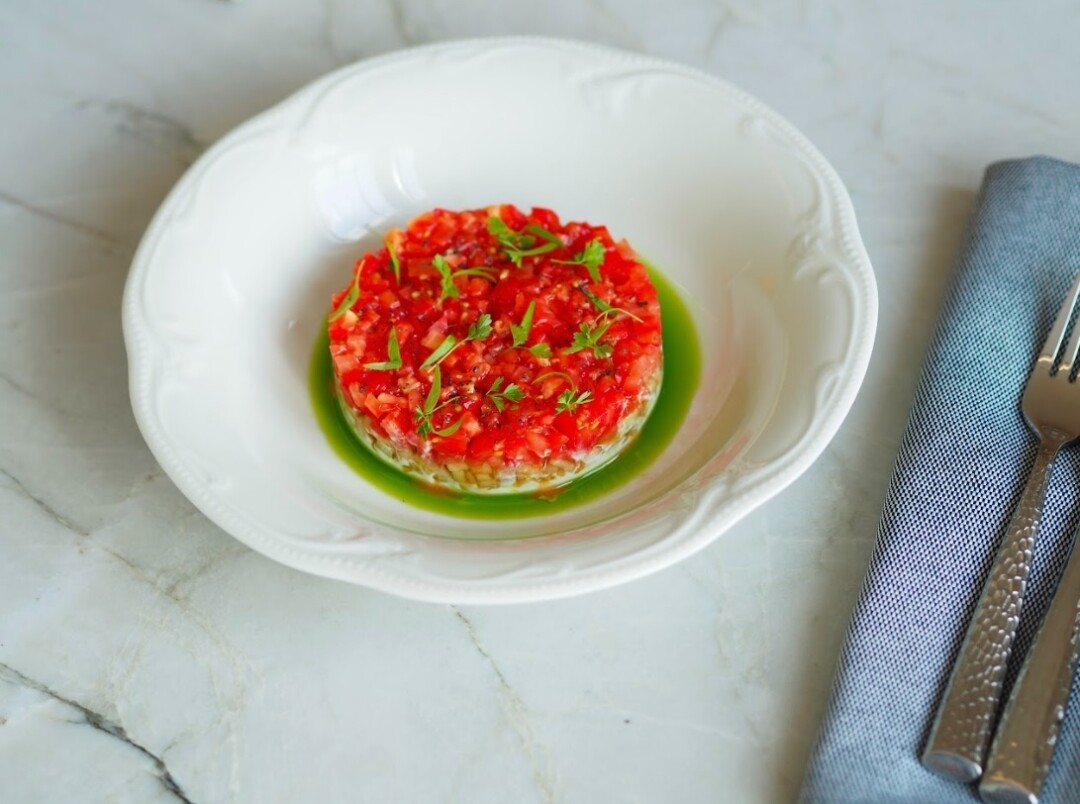 Тартар из томатов на подушке из маринованных огурцов и сливочного сыра выглядит максимально приближенно к своему мясному прототипу, а печеные перцы рамиро как по учебнику сочетаются с домашней рикоттой. В меню множество сырых морепродуктов: устрицы, морские ежи, креветки, гребешки, анадара — единственный двустворчатый моллюск с кровеносной системой и содержащий гемоглобин. Следующая остановка — паста и ризотто. Конкилье алла норма с томатами, рикоттой, которую засаливают самостоятельно, и баклажанами можно смело брать на двоих.
