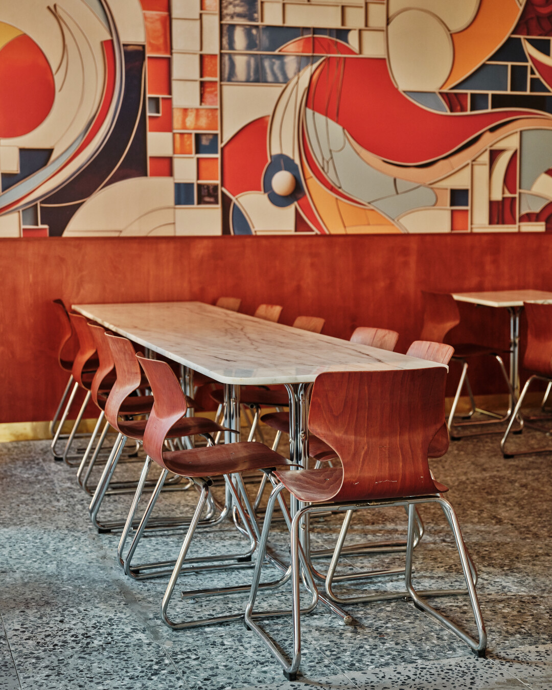 Интерьер описывает ситуацию, если бы диско жило в советском ДК. Дизайнер Сергей Семич, работавший и над другими проектами AF Brew (к примеру, Redrum, AF Brew Taproom на территории бывшего завода «Степан Разин», «Хоровод» — его рук дело!), определил на стены кричащее мозаичное панно, вдохновленное советским искусством на стыке абстракции и соцреализма. Встречает большая полукруглая стойка, лакированные деревянные панели, а на полу — оригинальное терраццо из 70-х. А о том, что здесь любят музыку сигнализирует диско-шар (по пятницам и субботам за пультом играют диджеи или звучит живое инструментальное исполнение).