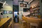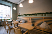 Внутри небольшого, человек на тридцать, кафе-бара чувствуешь себя как будто попал внутрь игрового набора — аккуратная светлая мебель, миниатюрный бар с цветными бутылками, мимимишка на триптихе авторства Павла Алексеева, симпатичная зелень в горшках и парящие палочки-светильники. А вот бургеры — совсем не игрушечных размеров. Следуя инфографике меню, их можно собирать самостоятельно. Булочка может быть с добавлением вяленых томатов, шпината или злаков, среди начинок — классика, курица с беконом и ананасом, треска с мятно-имбирным соусом, баклажаны, на гарнир — два вида картофеля, половинка початка кукурузы или фалафель. Булочки-соусы готовятся тут же, на кухне, так что бургер со свеклой, козьим сыром, авокадо и песто — сочный, практически сладкий и изобилует свежестью, с бараниной — не стесняется характерного мясного вкуса, активно подчеркнутого кинзой. Сторонние же от специализации позиции вроде спаржи или «Цезаря» пока в гармоничный ансамбль не складываются, что в бургерной и не так уж и страшно. В баре заведения можно найти лимонады с щедрой порцией сезонных ягод-овощей-фруктов и авторские коктейли Ивана Гринько, среди прочего раньше поившего гостей в «Северянине» времен Мурадяна. В бюро нужно приходить ровно за тем, что вынесено в название, не меньше, но и не больше — за хорошими бургерами, если они еще не до смерти надоели, и приятно выпить, например, терпкого эля.