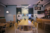 Миниатюрный кафе-бар, специализирующийся на бургерах с изобретательными начинками: славная идея монокухни на массовом материале.