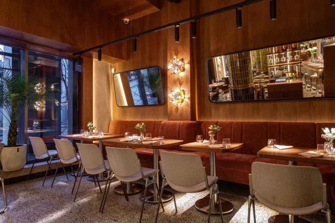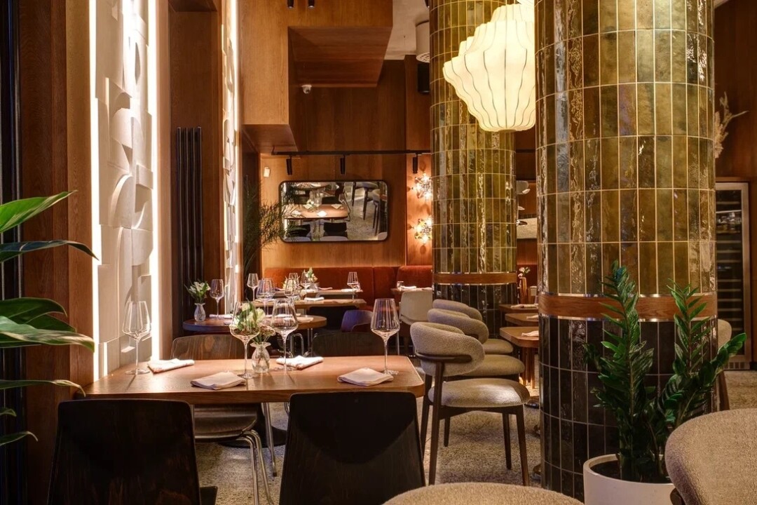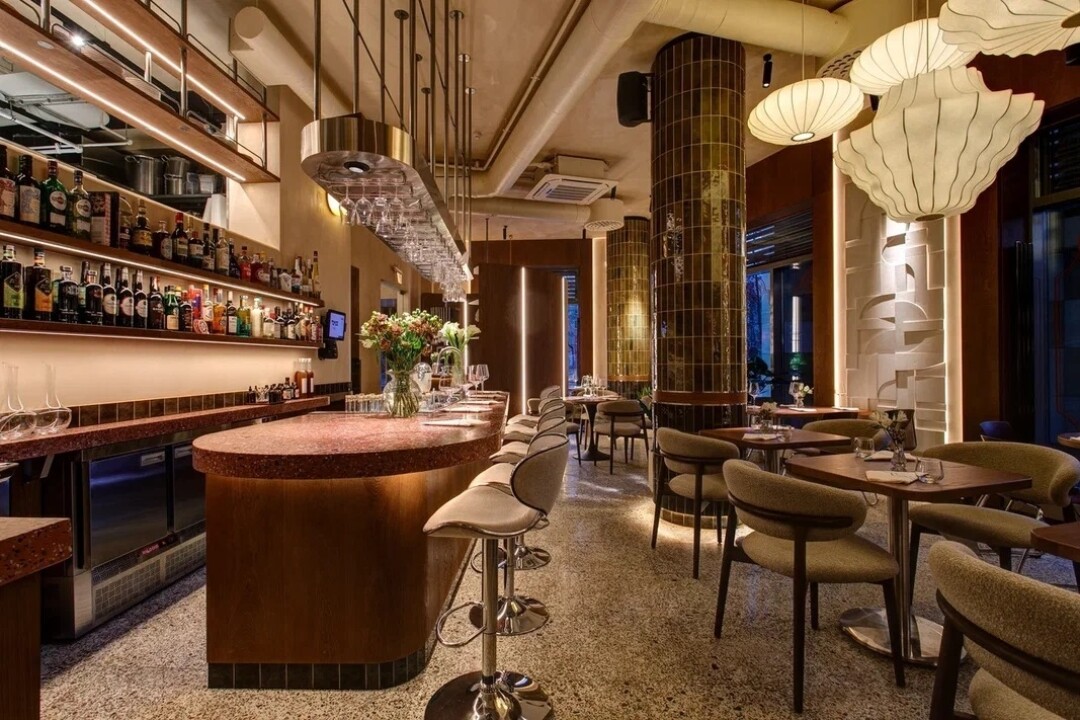 Мы заняли козырное место на пересечении Большой Зелениной и Корпусной улиц, тут отличные соседи: напротив ресторан «Сад», недалеко Futurist и Inner Алексея Алексеева. Дизайн интерьера — очень красивый! — разработала Ксения Смирнова (Sea, Signora, Big Wine Freaks). 150 квадратных метров, 50 посадочных мест и терраса, но это уже к следующему сезону. Важный акцент — «кухня на сцене»: считай, будем работать на подиуме. Обратите внимание на люстры, подружившие эстетику скандинавского минимализма со средиземноморьем, винтажные бра с отсылкой к романтике покорения космоса, латунный светильник авторства мастера Владимира Викторова.
