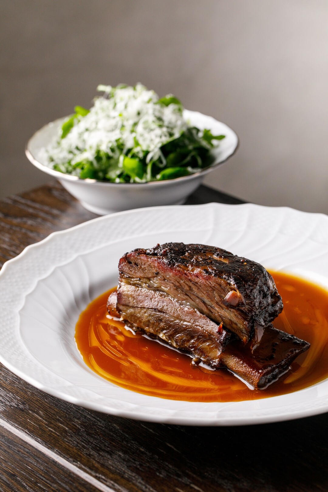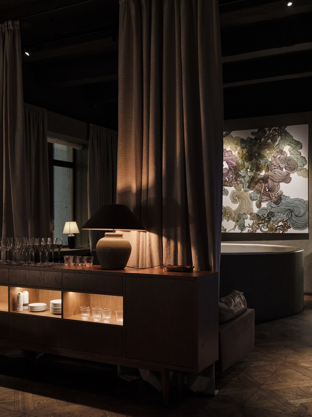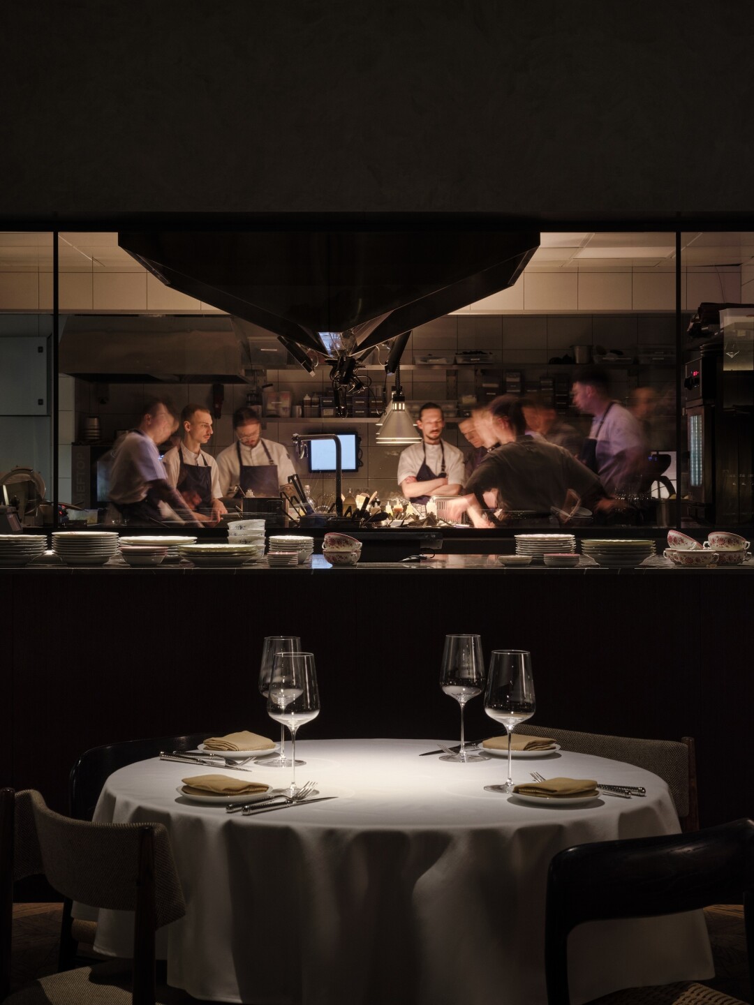 Интерьер от Алексея Пенюка (Studio APAA) остался практически нетронутым. Частично обновили мебель в духе old money, та же ротация современного искусства из частных коллекций. Но теперь количество посадочных мест — больше, да и света тоже (убрали жалюзи с окон), в зал вынесли цех холодных закусок и десертов, появилось окно в кухню, через которое можно наблюдать за работой поваров, готовящих для вас стейки и тартар. Обещают проводить chef's table!