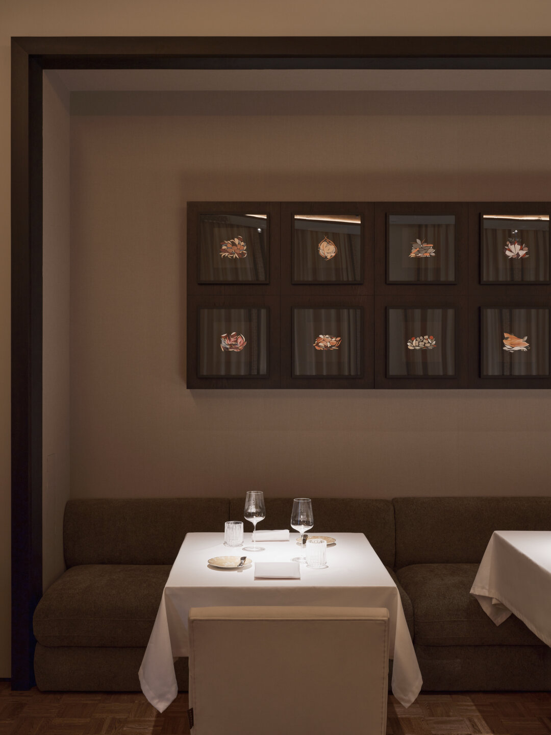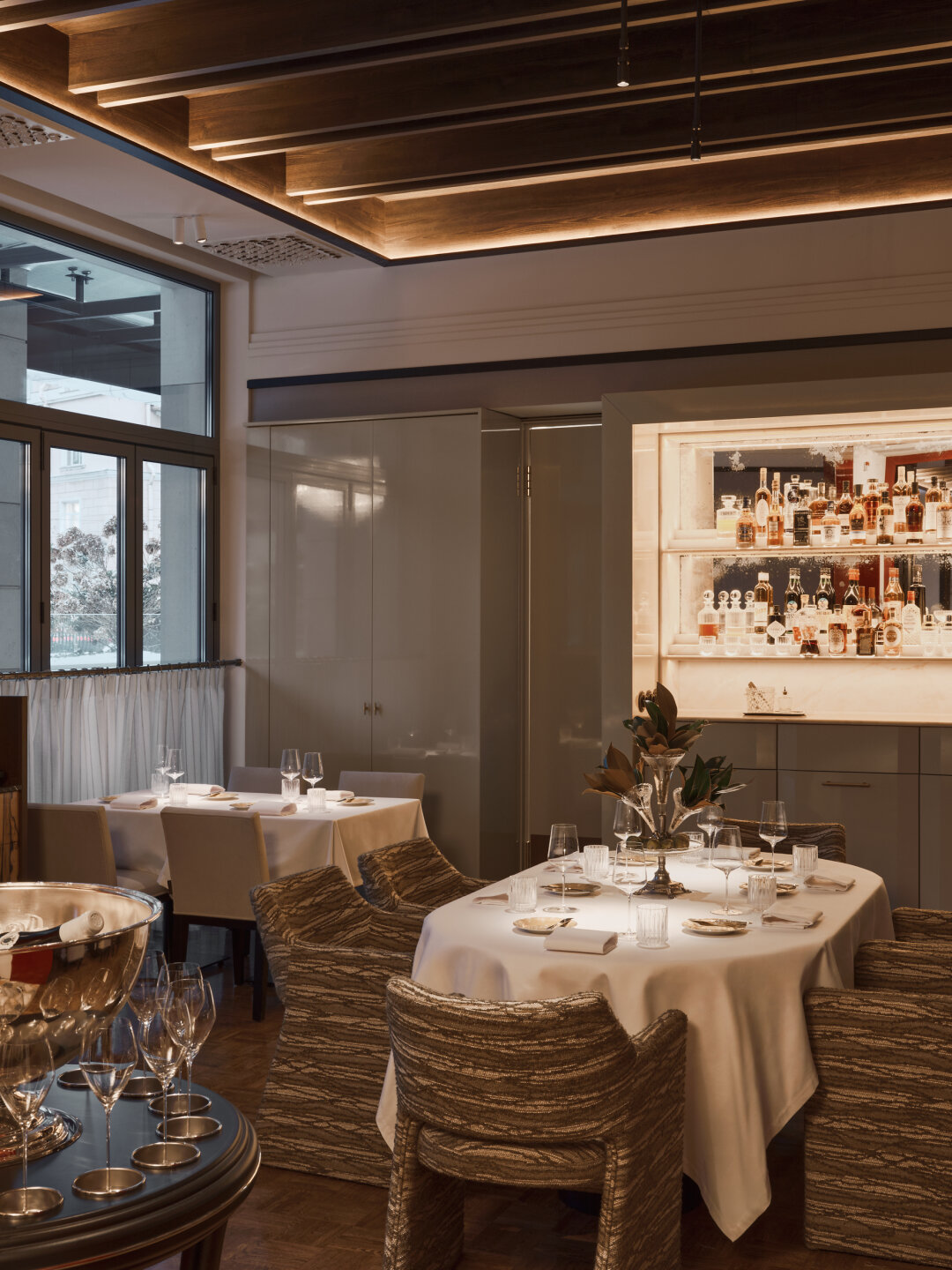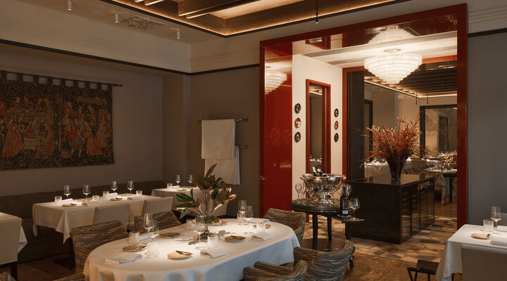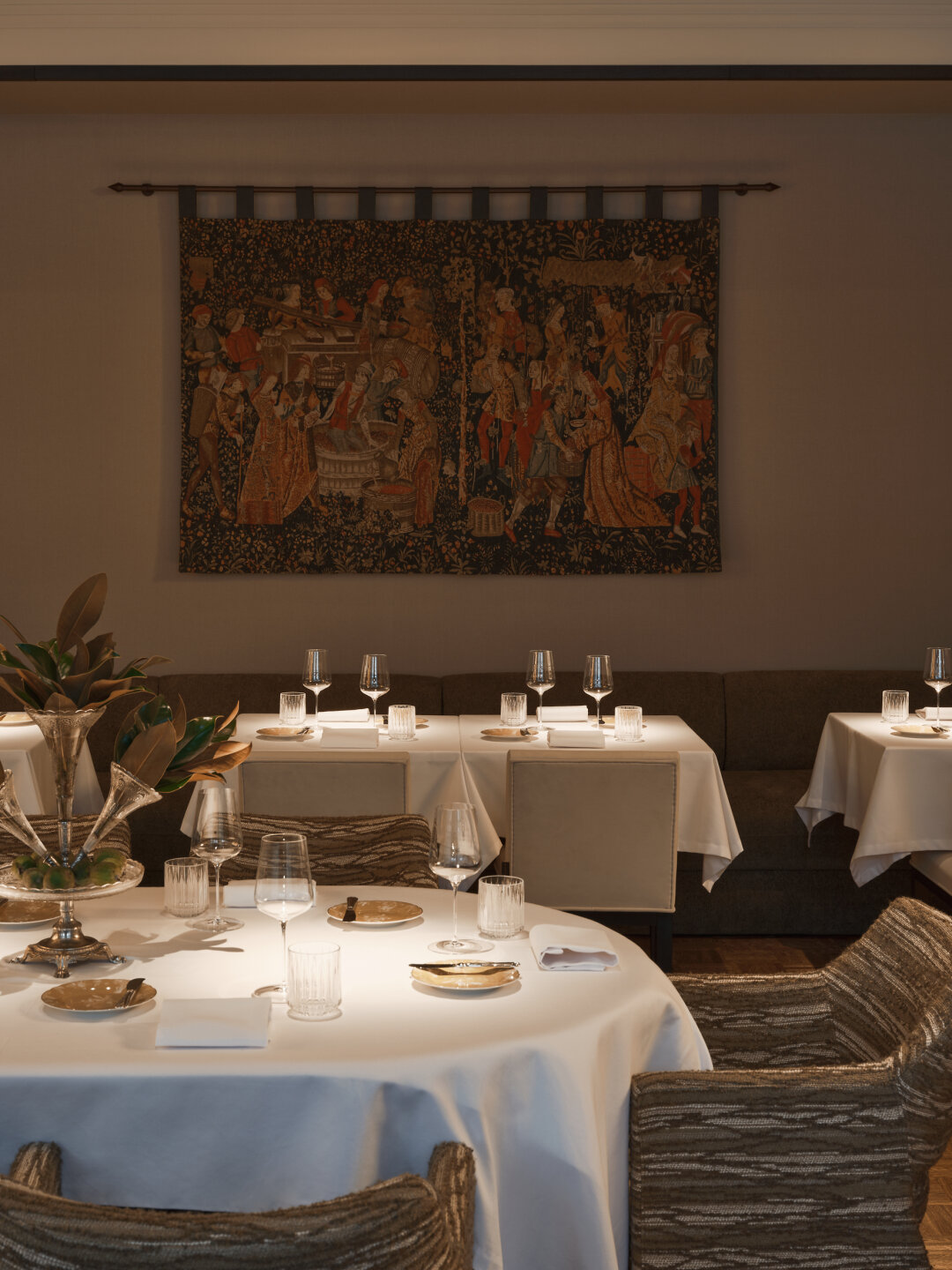 В интерьере от Анастасии Хальчицкой россыпь драгоценностей: муранская люстра Doria Leuchten, французский гобелен Jean Pansu, «овощная» работа, купленная лично у Алена Пассара, французского шеф-повара, чей ресторан L'Arpège с тремя звездами «Мишлен» стал полностью веганским летом 2025 года. На столах — белые скатерти и фарфоровая посуда из Германии, расписанная бергамотами по собственному заказу.