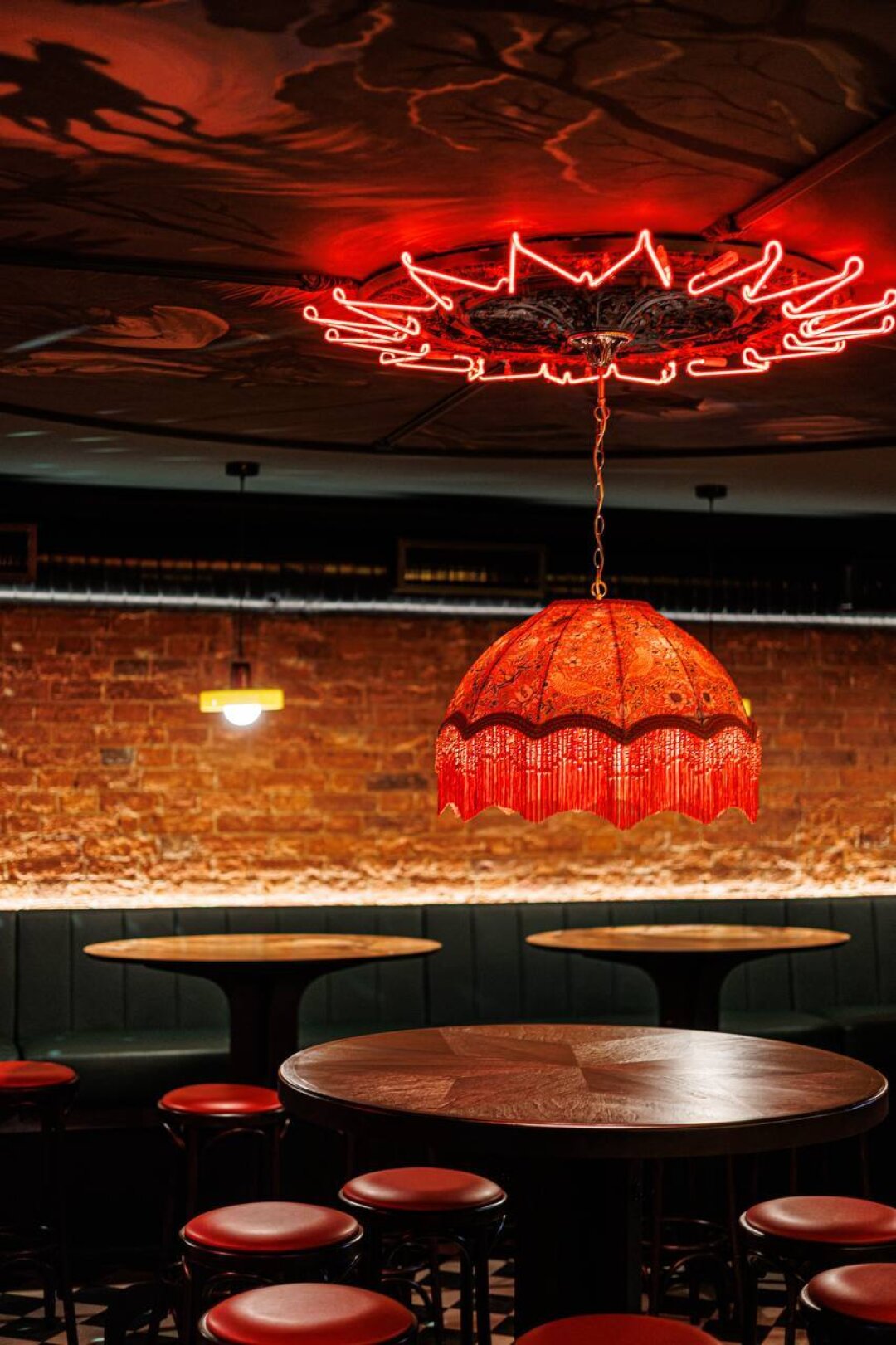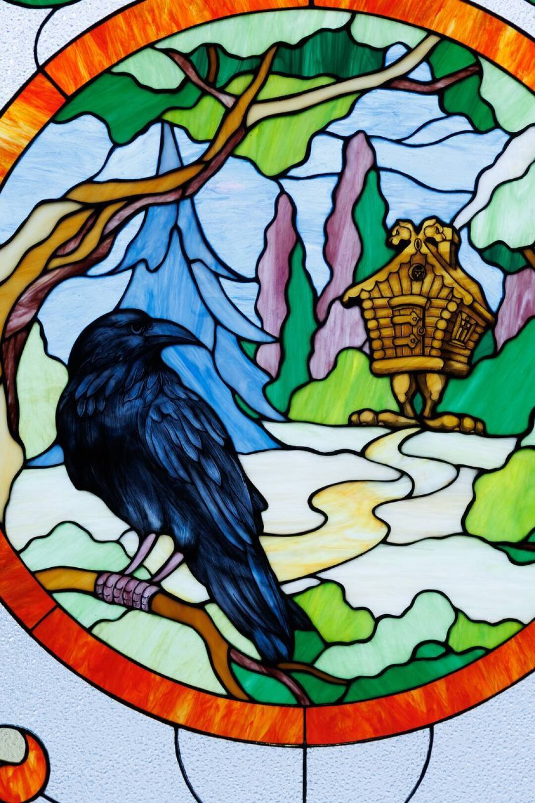 На потолке первого зала — роспись в духе Врубеля, мрачная, с глубокими цветовыми оттенками. Одно из окон украшает дивный витраж с изображением билибинской избушки на курьих ножках и ворона. Рисунки на стенах напоминают «сказочные» зарисовки Уильяма Морриса, а ритмичный орнамент пола — черно-белую клетку из «Алисы в стране чудес».