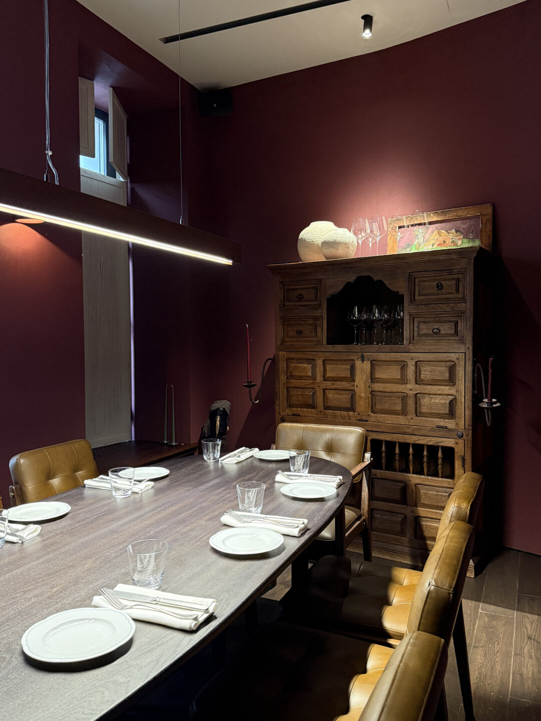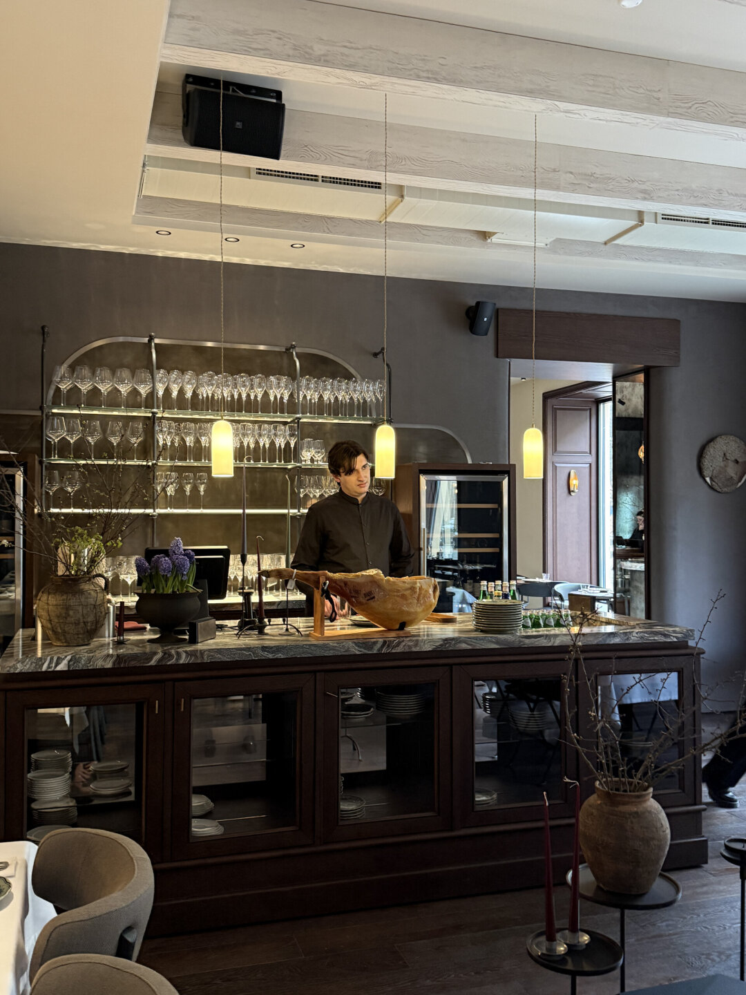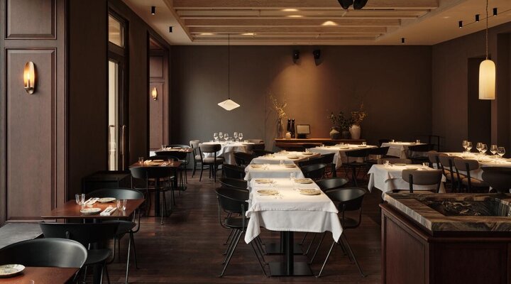 «Баски Монегаски» встречает лавкой с деликатесами и витриной с десертами собственного производства (берем канеле на аперитив). Здесь же винтажный шкаф из Индии, который адаптировали под сервант, барная стойка из мрамора, а по правую руку — зал с длинным коммунальным столом и задвигающейся дверью. В ресторане предусмотрели и секретную сигарную комнату с посадкой на восемь человек, помпезным шкафом из каштана, который транспортировали из Испании. Особое внимание уделили свету: светильники от бренда Serax и много свечей (романтике быть!). В мае откроют террасу во внутреннем дворе — вангуем, там будут все!
