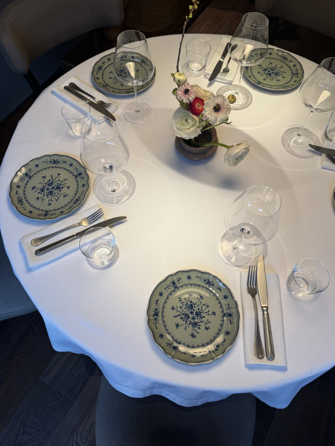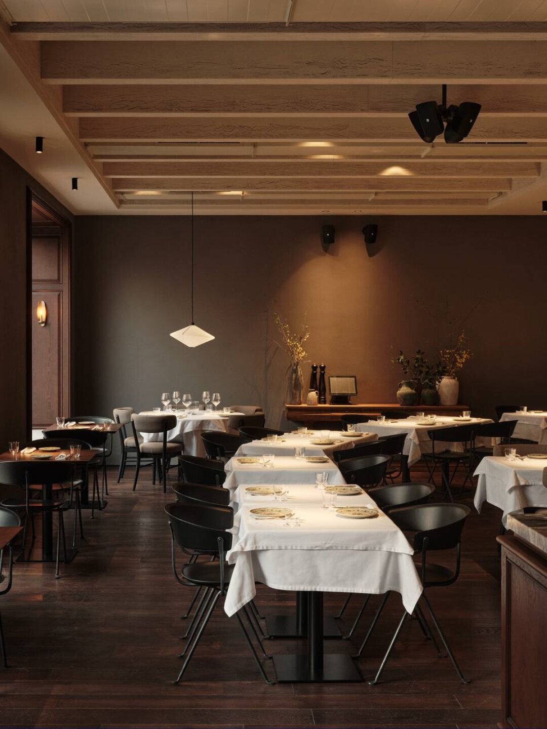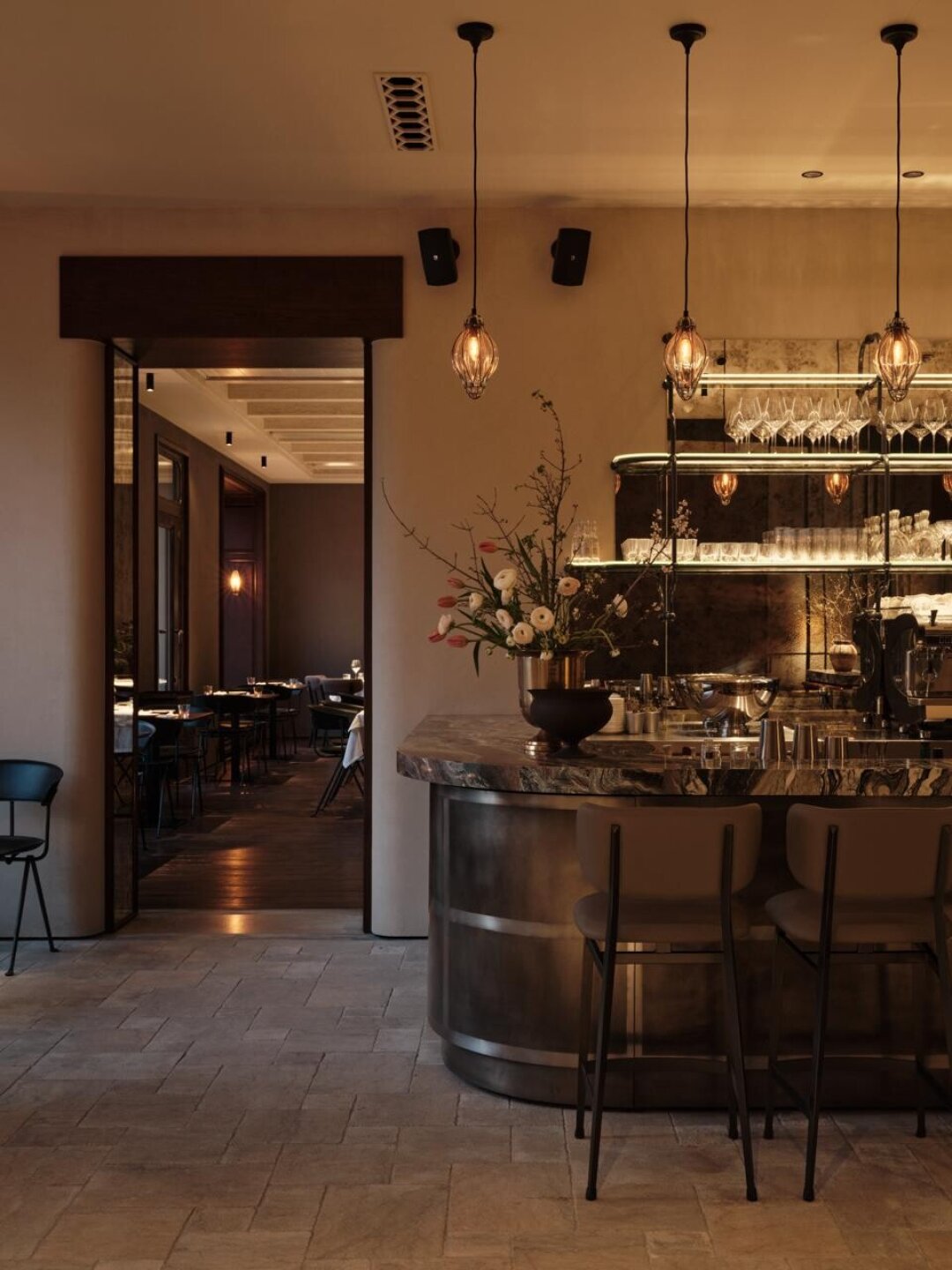 «Баски Монегаски» встречает лавкой с деликатесами и витриной с десертами собственного производства (берем канеле на аперитив). Здесь же винтажный шкаф из Индии, который адаптировали под сервант, барная стойка из мрамора, а по правую руку — зал с длинным коммунальным столом и задвигающейся дверью. В ресторане предусмотрели и секретную сигарную комнату с посадкой на восемь человек, помпезным шкафом из каштана, который транспортировали из Испании. Особое внимание уделили свету: светильники от бренда Serax и много свечей (романтике быть!). В мае откроют террасу во внутреннем дворе — вангуем, там будут все!
