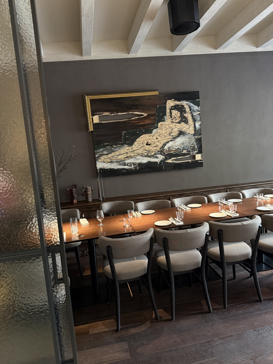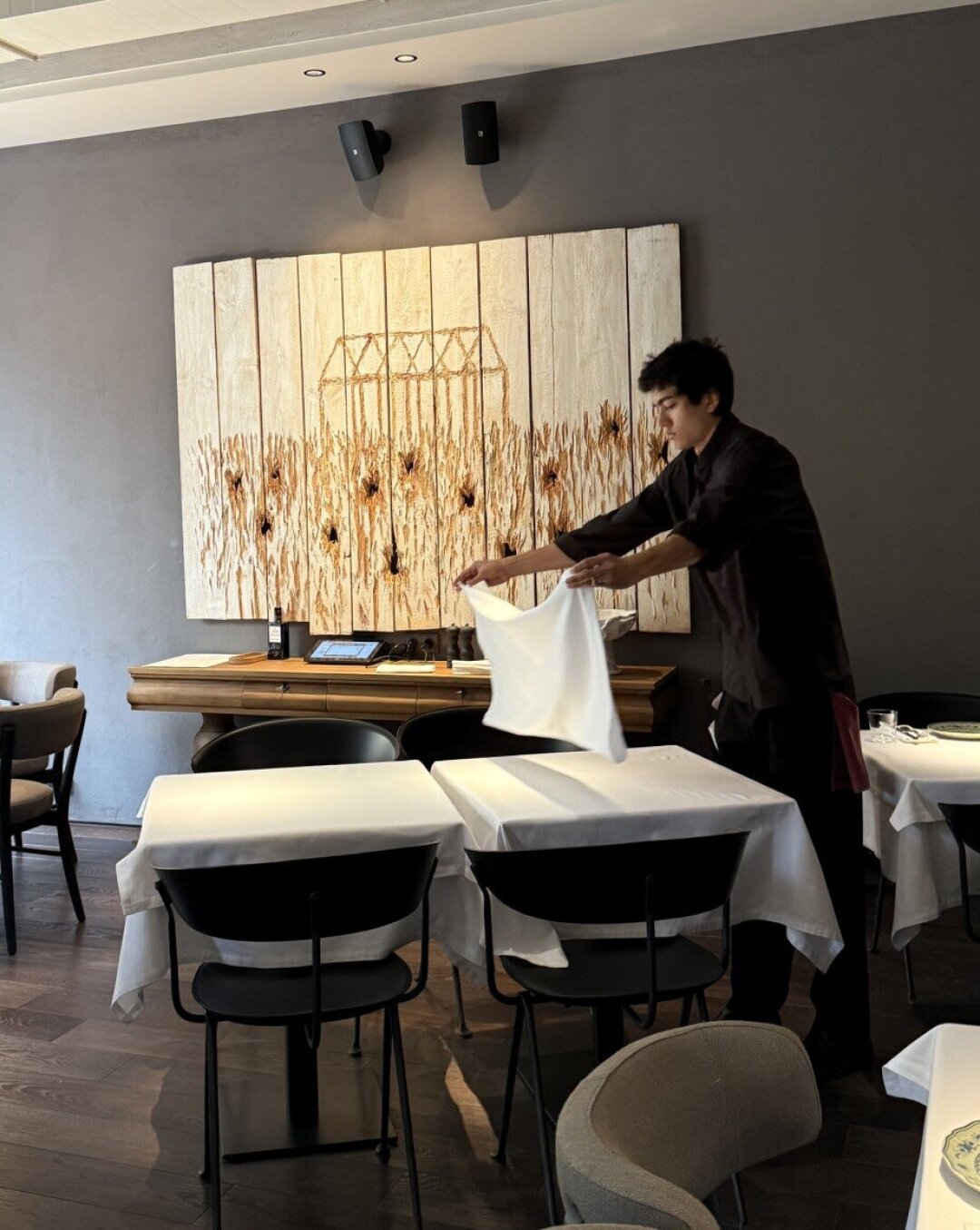 К хлебу в ресторане подают и зрелища. Чтобы наполнить Baski & Monegaski искусством, команда обратилась к Джессике (триумфатор Cosmoscow-2024!), основательнице Jessica Gallery. Так появилась серия работ художника-топорописца и архитектора в третьем поколении Нестора Энгельке (однажды он разочаровался в холсте и масле, взял в руки топор и начал рубить) — восторг! Глаз падает и на концептуальные объекты керамиста Веры Светловой — абстрактные вазы, арт-кирпичи и гипсовых женщин.