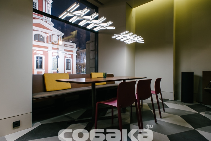 Интерьер Евгения Нейманда был особенно хорош по началу, когда еще не привезли геометричные панели, обыгрывающие тона цвета стен. Тогда очень просторный зал, с редкими посадками, выхваченными из него точечным светом, крепким духом 70-х, где много пластика и мало острых углов, и, главное, аскетично-серыми стенами казался съемочной площадкой фильма про будущее, как его видели во времена Холодной войны. Но, наверное, пустые стены для рестораторов что-то вроде дурного тона: как одни заполняют их тарелочками с росписями, так другие — чем-то, что кажется современным искусством. Так что теперь щекочущее чувство смешения времен тоже доступно, но только на местах, где футуристичные лампы из светящихся палочек наслаиваются на красно-белую архитектуру церкви.