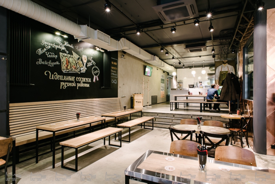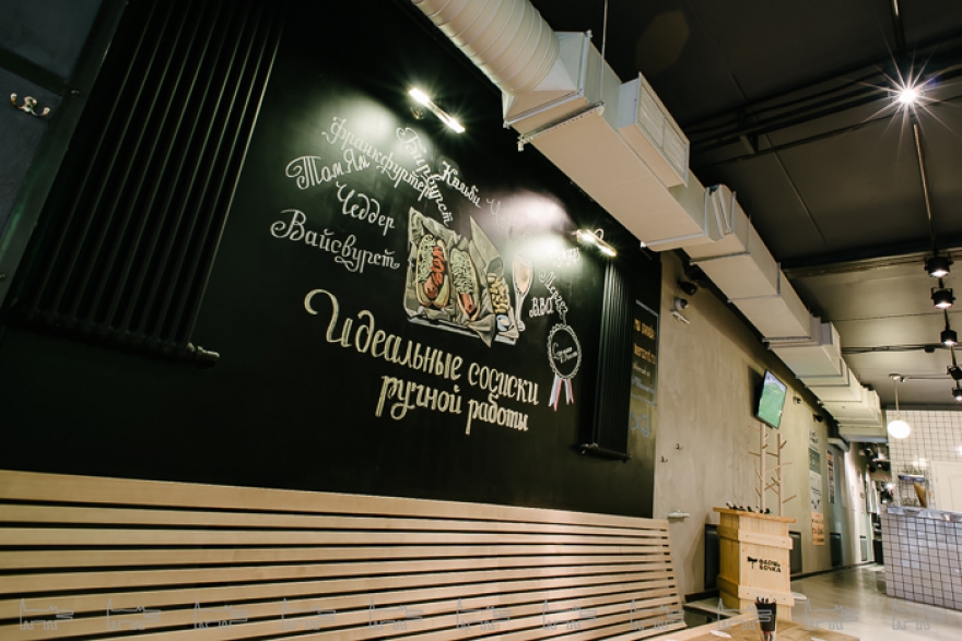 В одном зале с окнами в самый пол — столы со скамейками, исполинская барная стойка с грифельными досками, где выведен сегодняшний ассортимент бутылочного пива, открытый склад кегов и кухня, обозначенная брутальным снимком разделочного ножа. Оттуда поступают поддоны с сосисками, которые куда как занятно выбирать, как-будто решаешь, куда поехать в путешествие. «Том ям» — свинина с карри, «Мегрез» — баранина с мятой, абсолютный любимец гостей, «Калифорния» — с курицей и печеным чесноком, «Братвурст» — с свининой и чеддером. Наборы сосисок — за 590, 790 и 940 — выгоднее и по цене (одна стоит 240), и по смыслу: кажется, чего там, сосиски, но у каждой из них читающийся вкусовой характер. Скоро их будут маркировать флажками, хотя угадывать тоже по-своему интересно. К ним идет еще разнообразная капуста и, по желанию, булочка или картошка. Кроме сосисок есть несколько закусок вроде эмменталя с сельдереевой солью и хвороста с паприкой, суп-гуляш, пара салатов, чили кон карне, куриная грудка и один гордый брауни в десертах.