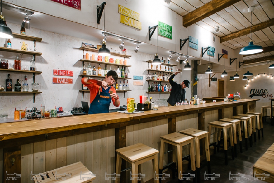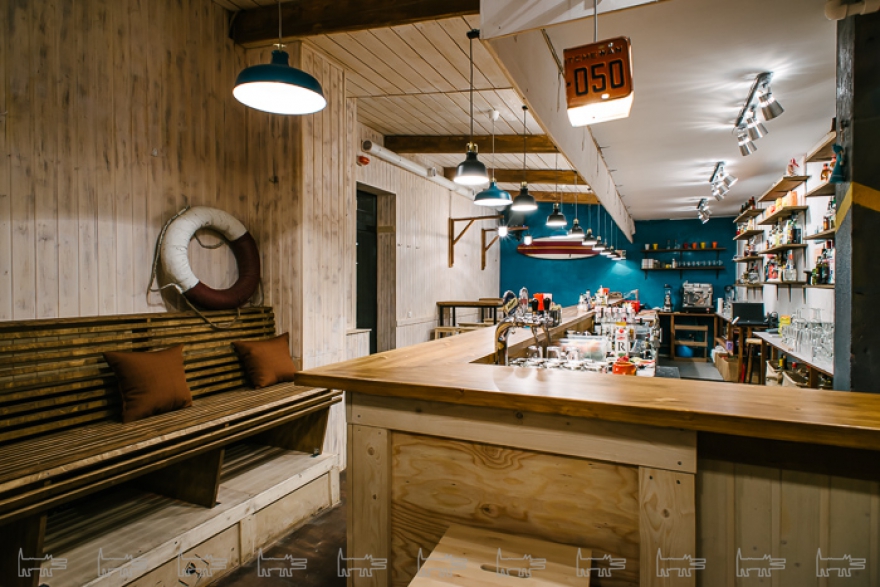 Компания хозяев — Андрей Васильев, Сергей Алексеев, Наталия Геллер, Никита Сергеев — планировала сделать тики-бар. Тики — это такие статуи-истуканы, распространенные в Полинезии, а потом на Гаваях. Они являлись символом богов, а заодно размечали границы и вообще использовались по любому бытовому и/или церемониальному поводу. Броскую визуальную культуру на службу общепита впервые призвали в 1934 в США: там открылся первый тики-бар — бамбук, маски, росписи и коктейли в стаканах-статуэтках. На «Пирсе 8/4», с цифрами в честь адреса, в итоге остались только последние — смеси с ромом, ананасами и другими тропическими радостями в яркой керамике. Такому решению можно только поаплодировать, все-таки обставить со вкусом туземную хижину еще никому не удавалось. Второй шаг в верном направлении — позвать дизайнером Андрея Перепечко, автора оформления дайнера Jack&Chan и победителя премии «Собака.ru» «Лучшие дизайнеры и интерьеры». В итоге южная тема из тотемной трансформировалась в пляжно-серферскую, но без надрыва, а намеками: тут доска, здесь спасательный круг — не больше. Cлепящее солнце, отсутствующее как по понятным климатическим причинам, так и в силу планировки, компенсируют светлое дерево, ряды разноплановых ламп и, как всегда в наших широтах, алкоголь.
