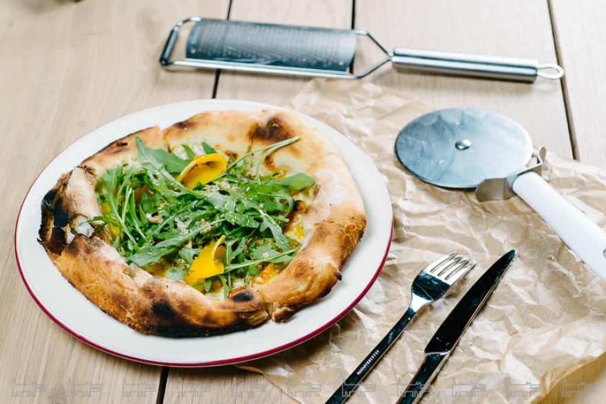 Гастрономия Co-op Garage при этом не оглядывается на классику, а идет в ногу с прогрессом. В салате смело объединены персики и ветчина — такой демократичный оммаж архетипическому сочетанию прошутто с дыней, мясного соленого и фруктового сладкого. Тот же союз ветчины с персиком, еще раз, и даже более удачно, повторен в топпингах пиццы. Она тут — главный раздел. Тесто пиццы небольшого размера с начинками, которые сами по себе складываются в рецепт удачного салата (взять, например, тыкву, рукколу и тертый тульский пряник), часто кажется просто основой для гастрономических ансамблей наподобие хлеба у сморреброда.