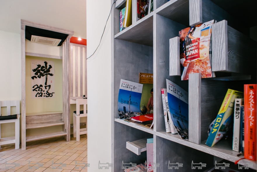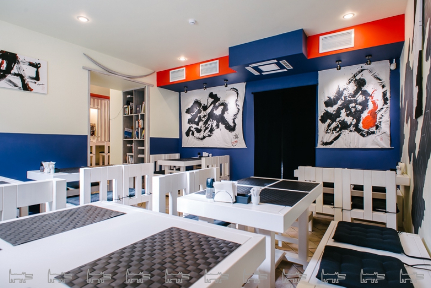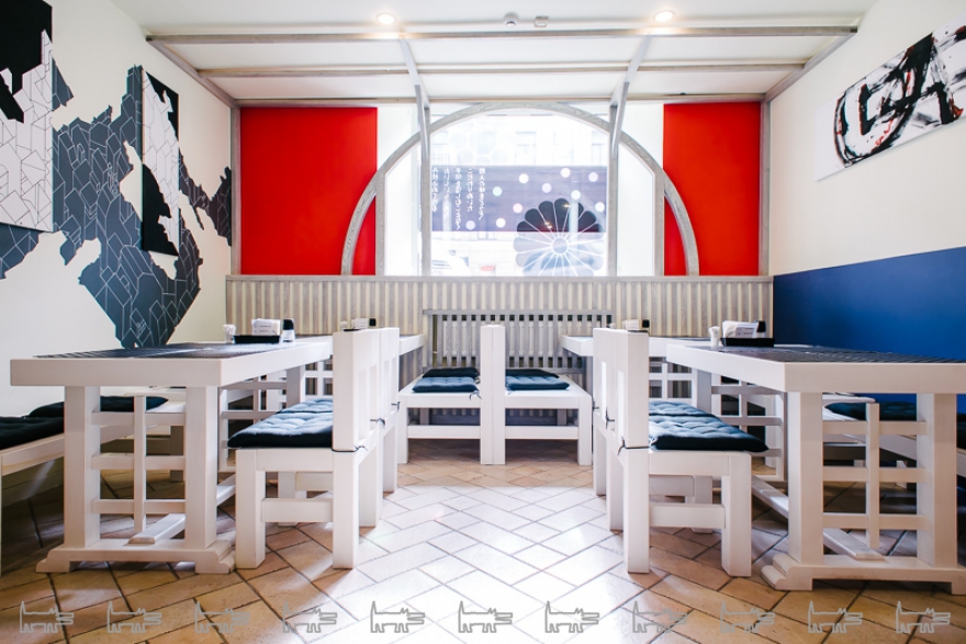 Интерьер: Пространство кафе, практически незаметного с улицы, обставлено с самурайской лаконичностью — разве средствами из Ikea. В первом зале открытая кухня и посадки на высоких стульях — чтобы помедитировать над плошкой лапши, наблюдая за хореографией движений поваров. Второе обеденное помещение — больше, спокойнее и предлагает не только поесть, но и полистать альбомы из микробиблиотеки на языке оригинала.