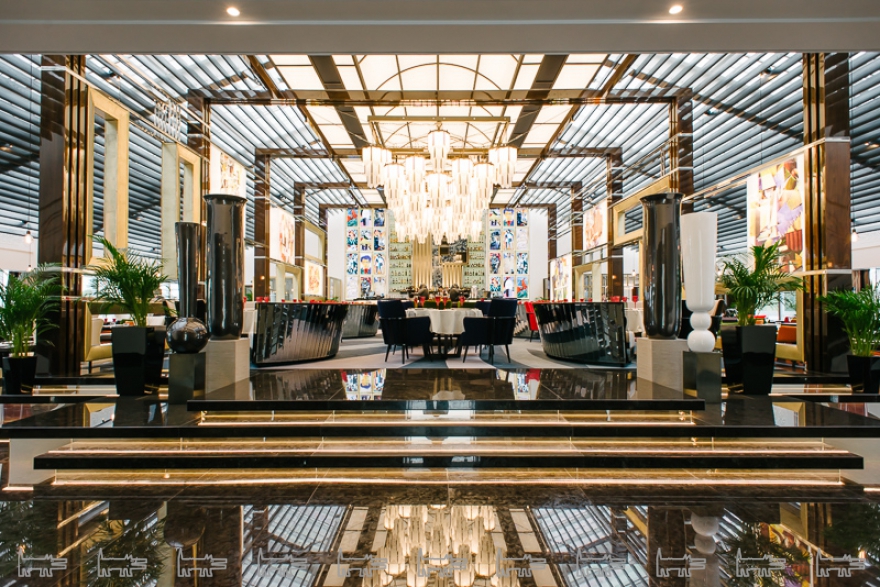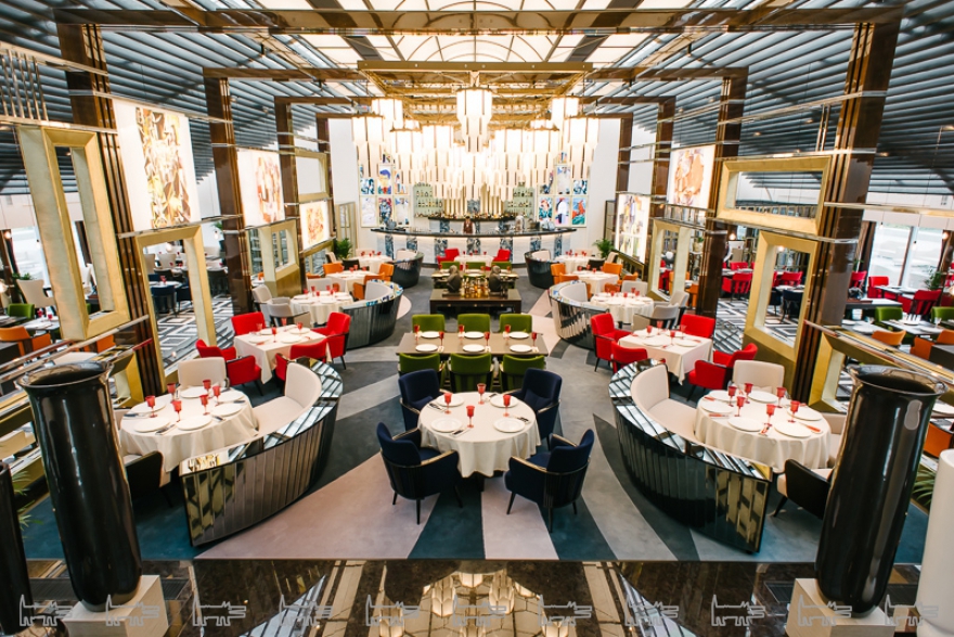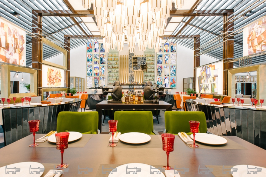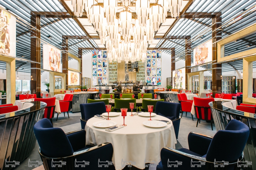 Интерьер: Логика планировки ресторана на четвертом этаже «Ленинград Центра» — ампир парадных советских ресторанов, только большой зал под высокими потолками на три зоны делят не колонны, а поблескивающие латунью рамы, в основании которых живой огонь побуждает к античного размаха возлияниям Дионису. Местные олимпийцы при этом — родом из русского авангарда: со стен как с иконостаса смотрят на гостей крестьянин Казимира Малевича, сам художник со своего автопортрета, «Швея» Надежды Удальцовой, «Человек в котелке» Роберта Фалька, фотограф-художник Шерлинг М.А. кисти Юрия Анненкова и другие первые лица живописи начала XIX века.