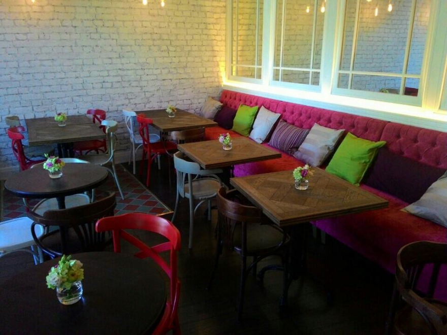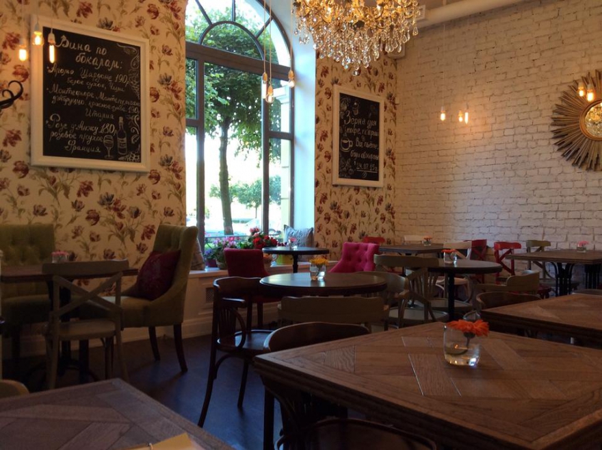 Интерьер: Оформление — классическое для кондитерских: белоснежные стены, разноцветные кресла и стулья, цветочный орнамент на обоях, стеллажи с чайниками и молочниками самых разных габаритов. Два зала могут принять почти пятьдесят человек.