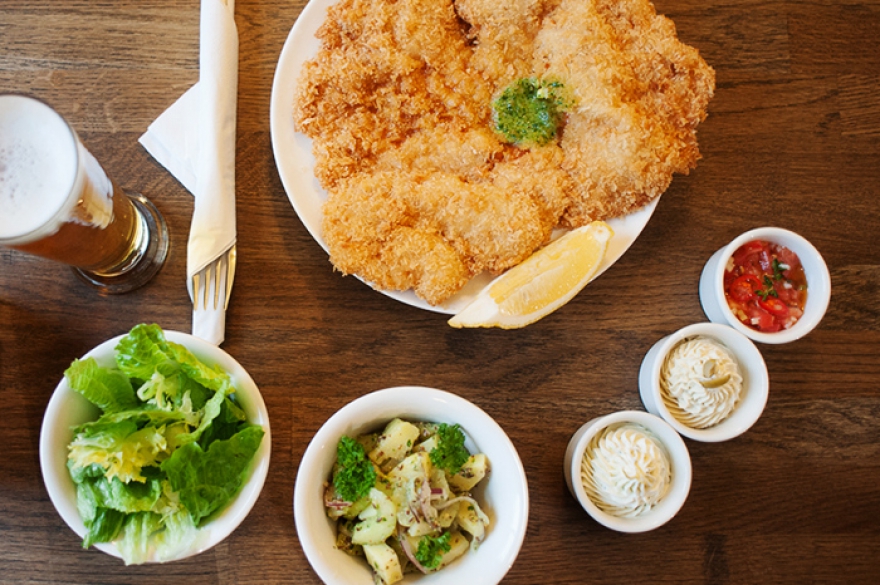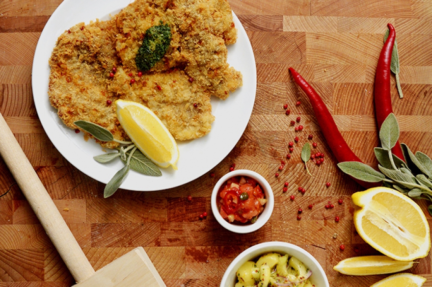 Шницель — тонкий пласт мяса в сухарях или муке, обжаренный в раскаленном масле — еда основательная и на первый взгляд простая. Но если подходить к его (шницелю) приготовлению и подаче как к главному и единственному делу в жизни, даже тут можно сделать гастрономический аттракцион. Новый петербургский Schnitsel – как блюдо, так и место — именно такой: вроде выбирать себе блюдо не нужно, оно в меню всего одно, но пока ты пропустишь через себя всю дополнительную информацию, кажется, составил себе многокурсовый сет.
