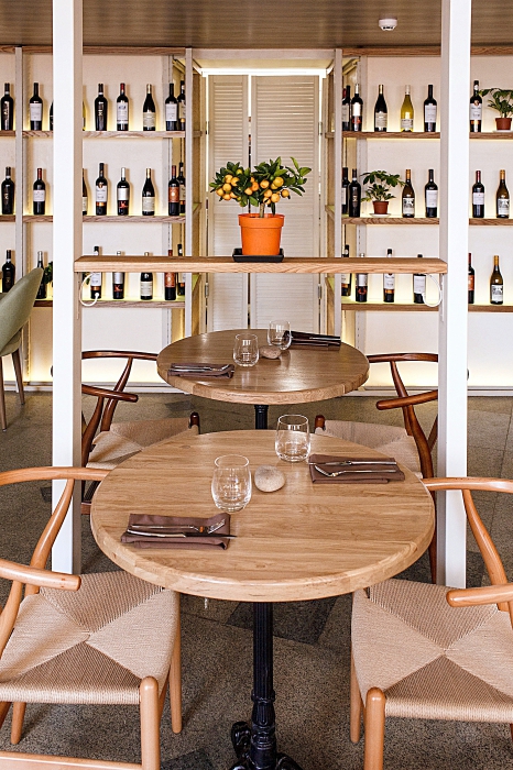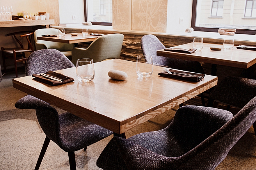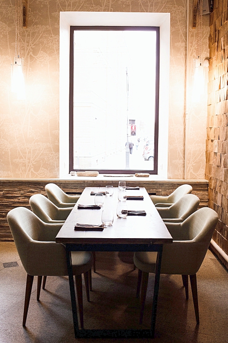 Если задуматься, как мог бы выглядеть скандинавский гастрономический тренд newnordic по-петербургски, то Gras как нельзя лучше подходил бы для иллюстрации. Интерьер не обдает холодом излишней лаконичности, но и декоративностью не злоупотребляет — полированное светлое дерево, нежно-травяной цвет стен, стеклянные двери и кресла, цвет которых идеально описывает британская идиома salt & pepper. Самые выразительные объекты здесь — панно из мха и крутая винтовая лестница с кованными перилами — как-будто оммажи местным болотам и дворцам. Через общую входную группу (но у каждого свои двери и гардероб) находится дочерний бар Madbaren с упором на коктейльный фудпейринг, но он получился таким симпатичным самостоятельным, что и рассказывать о нем стоит отдельно.