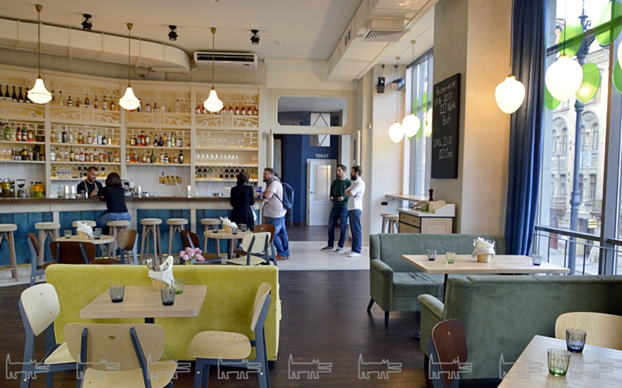 Social Club задумывался как новое слово — ресторан-театр, ресторан-концерт. Хотя вечером буднего дня здесь пока ничего о богатой арт-программе не говорит, и это здорово — не отвлекает от возможности провести в полной благости время под беспрецедентно высокими потолками и с видами через монументальные по размеру окна. Здесь как-будто другое измерение, как пройти через стену на платформе 9 и три четверти. Внизу на Рубинштейна — барный задор, из каждого второго заведения выплескивающийся наружу гомонящими гостями, внутри едален тоже не дадут пропасть ни сантиметру — обедать на подоконниках уже давно обычное дело. А в Social Club, интерьер которого сделан студией дизайна Kapodaki — планировка, сохраняющая приватность каждому дивану и столу, коридоры для променада и барные стойки, за которыми спокойно рассядется большой мьюзик-бэнд. .