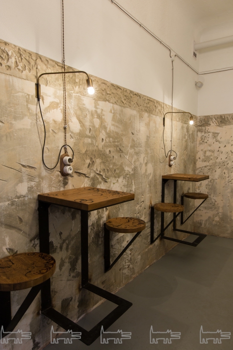Многократно анонсированный проект Екатерины Бокучавы открылся в середине августа и за месяц запустился в полную мощность. Кофейня с первого взгляда производит аскетичное впечатление, однако это сознательный эффект, на который работают различные декоративные приемы: ссылки на антураж скальной обители какого-нибудь Святого Эспрессо явно не случайны. На одной из стен фреска, потерявшая как-будто от ветхости четкость: на ней — ангел, напоминающий того, что с Александровской колонны, и лев, тотемный зверь Петербурга. Другие стены стилизованы под необработанный камень, траченый временем. Завершают интерьерную композицию по-спартански строгие барные стулья и столы с якобы вечность назад оставленными следами из-под кружек.
