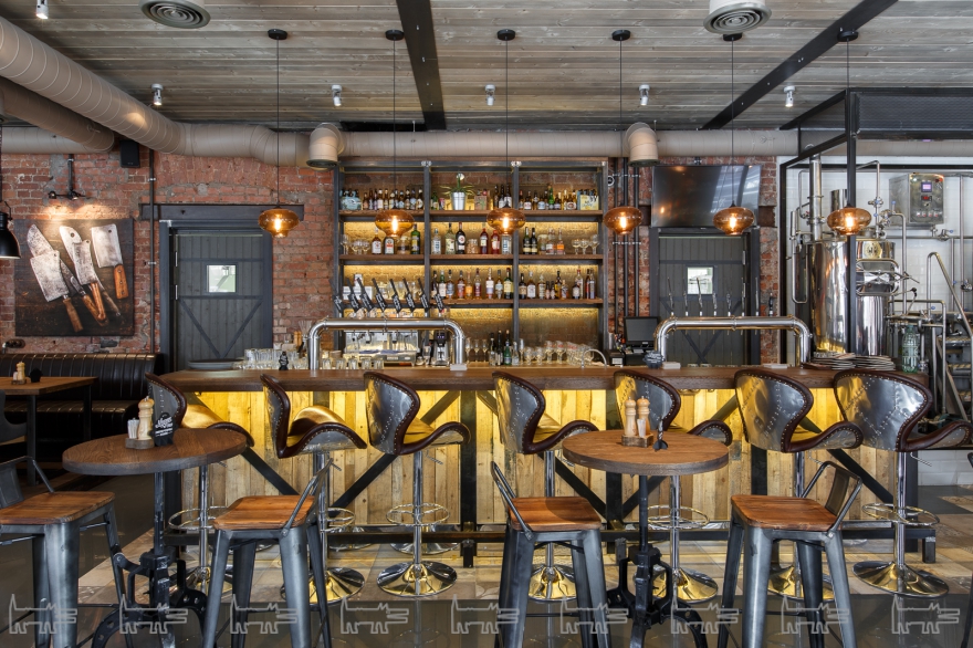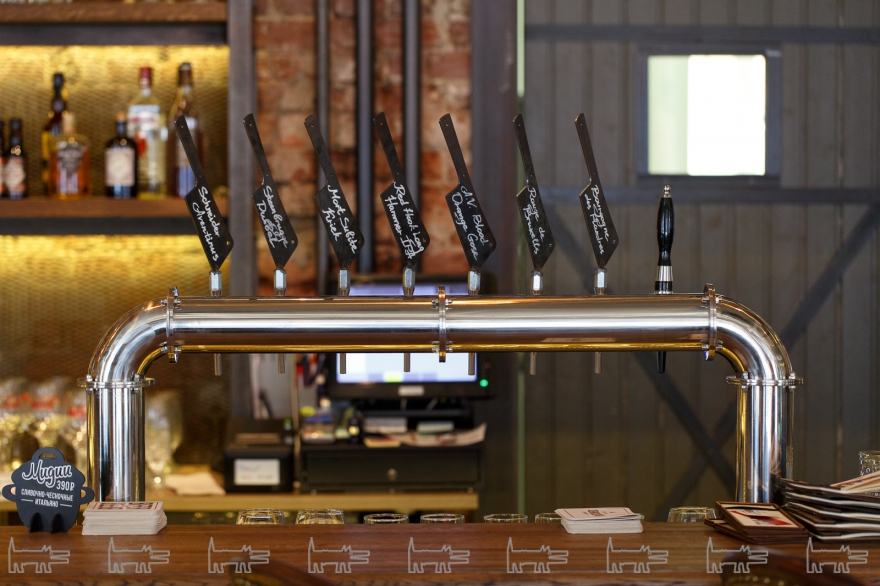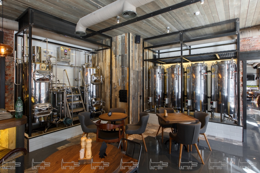 Объединение мясников сделало ставку не только на свое собственное ремесло. Если в правом зале находится станция с грилем, то в левом зале — открытая пивоварня: в зале можно увидеть варочный порядок — это где варят, бродильные емкости — где происходит брожение, и сложное хитросплетение пивопроводов. Атмосфера места соответствует дуэту пива и мяса — стены обшиты брутальными досками, барные стулья — металлом, на экранах Луи Дефюнес чередуется сырым филе миньоном, присутствует живопись с орудиями мясницкого труда.