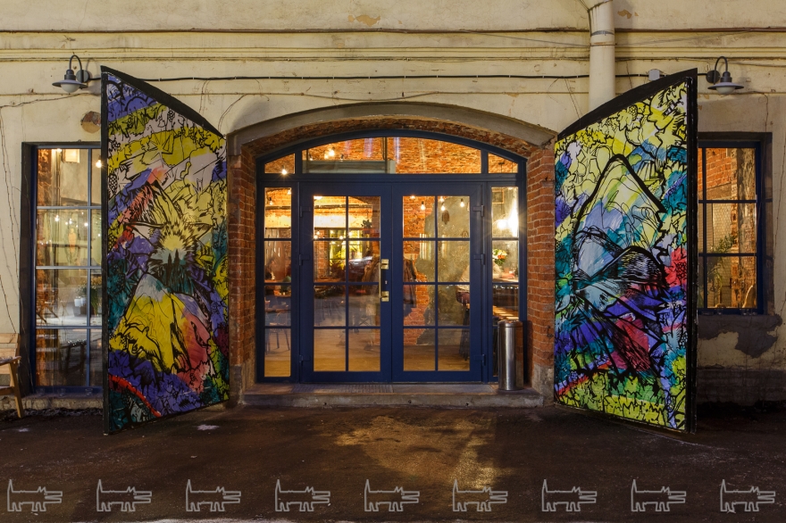 - На внешней стороне ворот, через которые входят в ресторан — реплика на древнегрузинскую миниатюру XII века с национальной купюры: воину вместо двух луков вручили два кувшина с вином. На оборотной, которую видно из зала — стилизованный пейзаж района Казбеги.