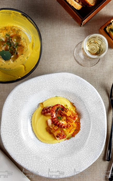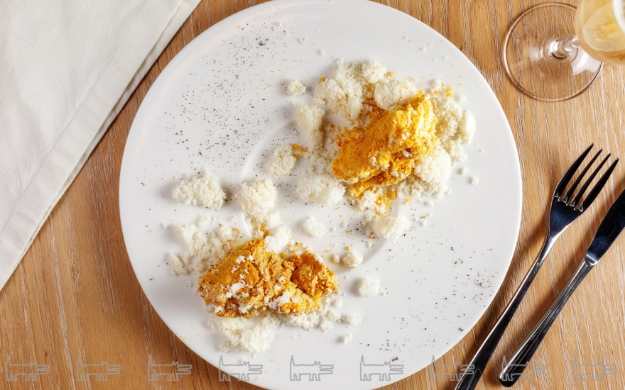 Осьминога в грушевом соусе мощно поддерживает картофельный крем. Ленивая лазанья с кроликом — многослойная пирамида из пасты, утопающая в сливочном соусе. Тушеная капуста с яйцом — четверть большого кочана с глазуньей, пармезаном и землей из хлеба. Монументальное бедро цесарки идет с не менее монументальными бобами гигантской лимской фасоли и ломтиками колбасы чоризо и соусом из нее. Средняя же цена горячего блюда из этой секции меню — около пятисот рублей. Это — хорошая сделка кошелька и желудка. Если прийти на бизнес-ланч с 12.00 до 16.00, то за те же деньги предлагают сразу весь обед — например, салат с судаком, яйцом, булгуром и кремом из крыжовника, суп из тыквы и пастернака и строганов из индейки с грибной икрой и вареньем из соленых огурцов: все это еще сопроводят свежевыпеченным хлебом с домашним маслом с ряженкой и спирулиной и десертом.