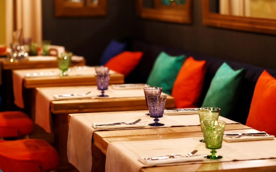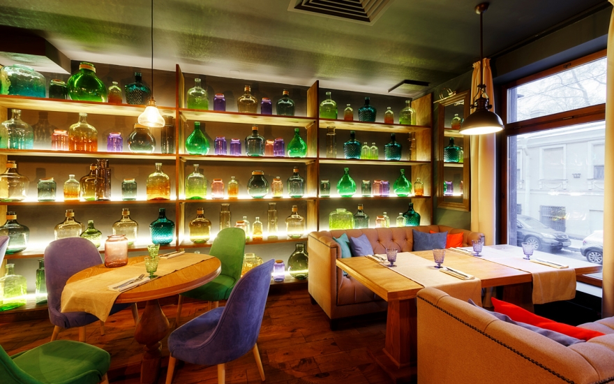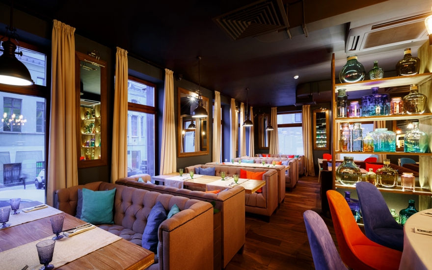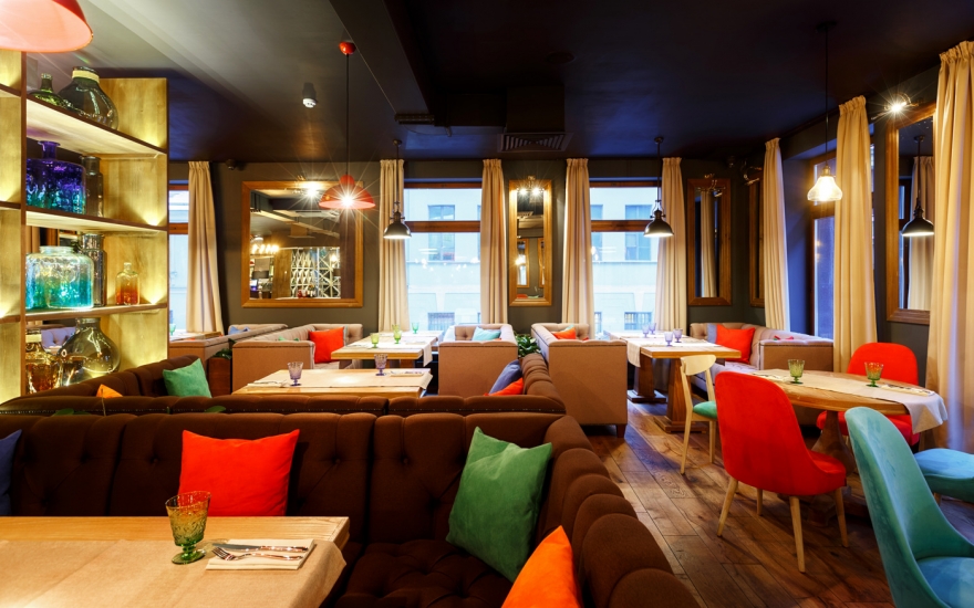 Над творческой подачей особенно потрудились в десертах. Медовик с горгонзолой больше похож на «Графские развалины», шоколадный кейк — на иллюстрацию к последним дням Помпеи: брызги алого черничного-ромового соуса и крошево пепельного цвета из меренги с чернилами каракатицы. Хорошо, что такое декоративное буйство осталось только на тарелках и не сказалось на интерьере: московская студия Dba-group сделала простое располагающее пространство с энергичными акцентами разноцветных кресел.