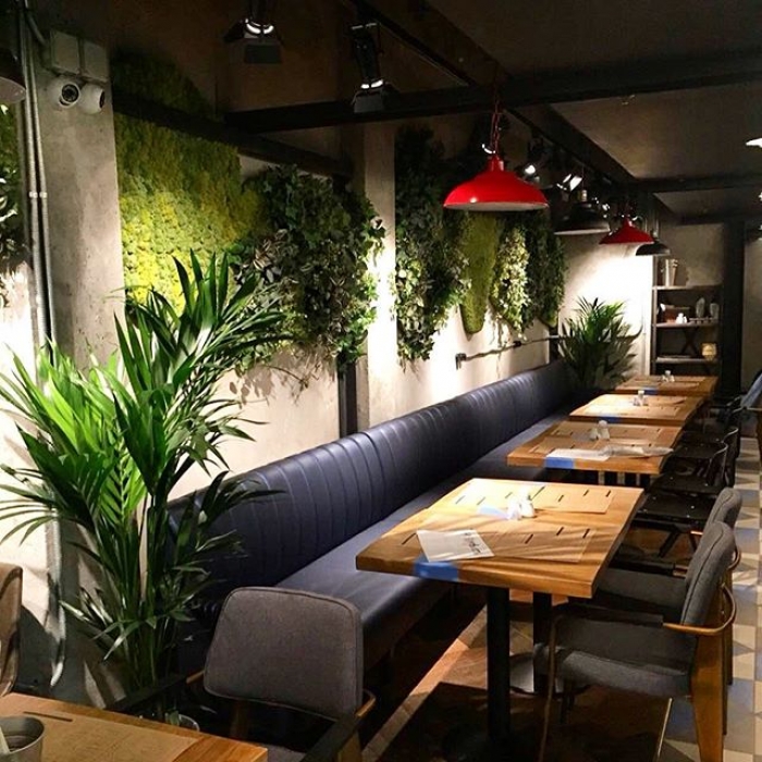 За интерьер отвечал Илья Дмитриев, который разрабатывал все проекты Ketch Up Burgers. Органик-лофт с акцентами из бетона, металла и натурального дерева смягчен большим количеством зеленых растений. Главное отличие пространства в Озерках – отсутствие кирпича и мох на стенах. Большой зал на 150 посадочных мест рассчитан и на большие компании, и на семейные обеды по воскресеньям.