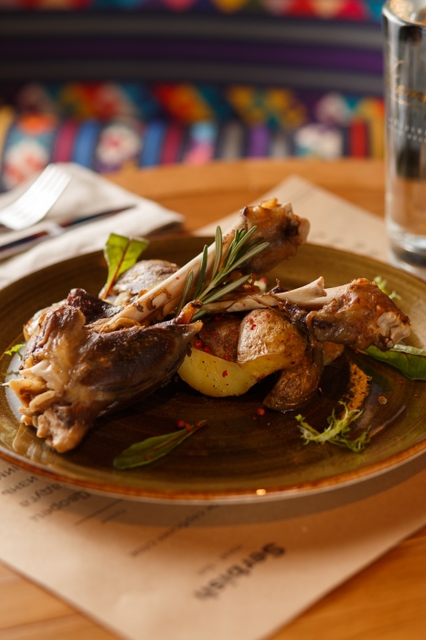 На сербском столе, как у балканской страны, не имеющей выхода к морю, всему голова — мясо. Рубленые колбаски чевапы здесь действительно просто песня — про мясной сок и аромат гриля, который на родине называют роштилем. В плескавице котлета тоже гипнотического свойства — и, как и положено, никаких лишних вложений между лепешками кроме мяса. Однако рыба и морепродукты в меню тоже включены — на правах посланников приморского региона Далмация, который находится на территориях Хорватии и Черногории: готовят осьминогов по рецепту полуострова Луштица, кальмаров фаршируют прошутто и сыром, мидии делают в красно- и беловинном соусе — последние, впрочем, трагически пересушены. Парадные блюда при этом на равных конкурируют с великим трио народных закусок — каймаком, намазкой из подсоленных сливок, пресной лепешкой сомун и айваром, пастой из печеного перца: она, вопреки традиции употребляться холодной, подается подогретой — и это просто и прекрасно.