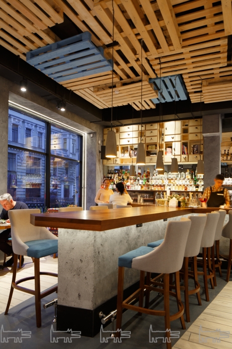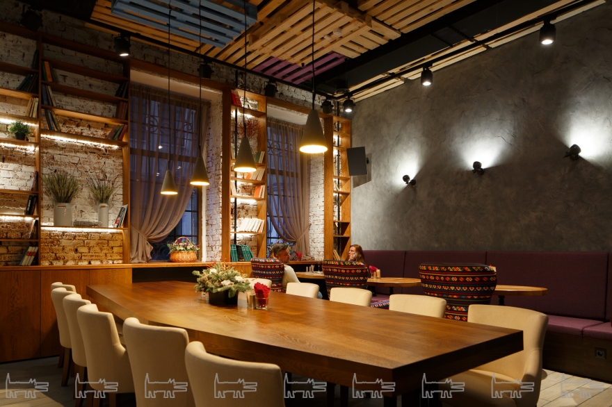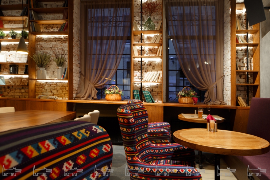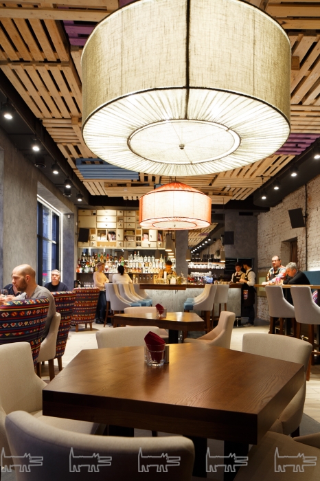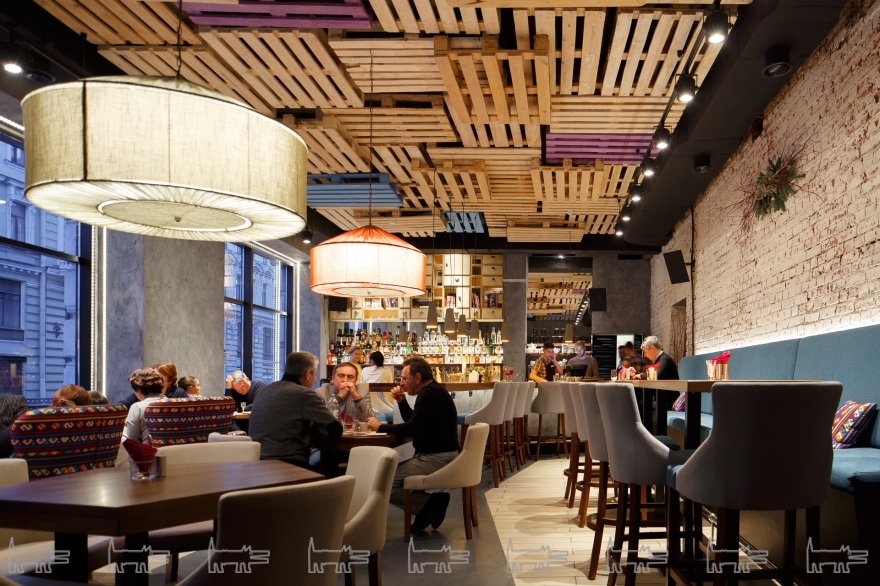 Кухни балканских народов в Петербурге последние несколько лет эксплуатировали стритфуд-проекты: взять хотя бы хит городских Ресторанных дней и фестивальных маркетов сербскую плескавицу, которой взялся кормить всех фуд-трак Ukusno. Поэтому так неожиданно по адресу нового сербского заведения находить высокие потолки, большие окна и массивные пятиугольные столы и надиктовывать заказ официантам в белоснежных рубашкам и чуть ли не в таких же перчатках. Чересчур официально все это не ощущается — разноцветье этнических орнаментов и теплый свет делают свое дело. За непринужденность, возможно, были призваны отвечать и паллеты на потолке, но элегантным такое решение не назовешь.