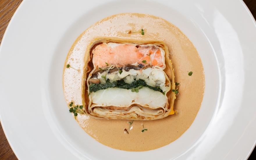 Однако повод для исследования ресторана — как раз совсем не контекст проекта, а силы, призванные на кухню: родные нам Алексей Ермаков, кормящий нас в лучшем баре 2015 года по версии премии «Что где есть в Петербурге» El Copitas, и Артем Моисеев, со-идеолог Must Have Bar, который поит нас на ивентах суаэрами и инжирными маргаритами. Неожиданная коллаборация предсказуемо дала результаты в виде обширной коктейльной карты и проевропейского меню с авторским прочтением — пате из печени кроллика с гречишным медом, нисуаз, салат с креветками гриль, куриное консоме и говядина веллингтон. Что кухня занималась проработками чуть ли не год, чувствуется — уверенного качества луковый суп, хорошие соленья — чуть взявшиеся черри, деликатно замалосоленные огурцы и сладко-соленая капуста с морковью, буйабес и капустные конверты с потенциалом — если кухня встанет на рельсы ежедневной посадки.