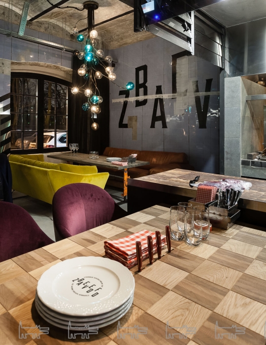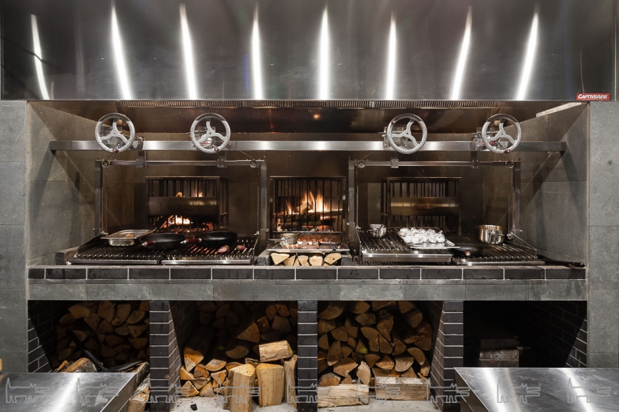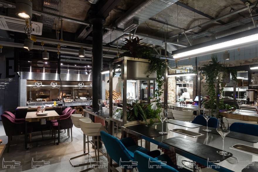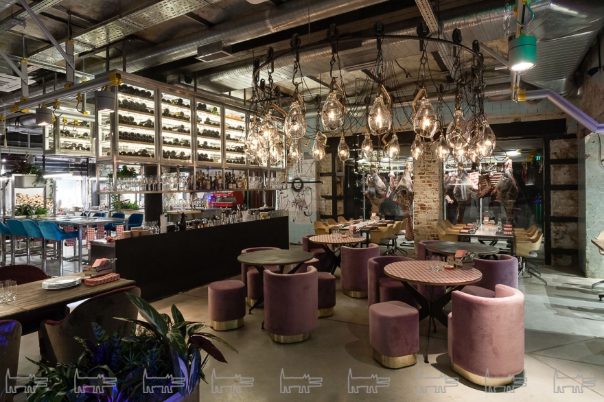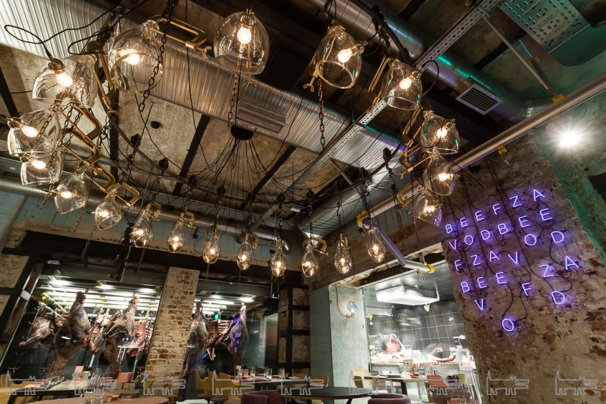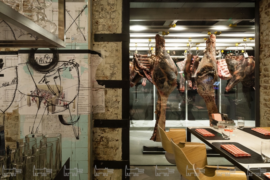 За ресторанным залом находится соразмерная производственная площадь: пункты приемки туши, система ее транспортировки — рабочая линия для передвижения крюков, кстати, выходит в зал, на ней развешаны светильники. За стеклами, выходящими в зал — камеры вызревания, где доходят пятнадцать туш одновременно, и разделочный цех. Взглядам явлено не только это: обеденные столы вплотную подходят к махине гриля Grillworks — и кухня, и барная стойка не имеют даже формального отделения от едоков в виде стеклянной перегородки. Последовательное следование концепции дало своих результаты: вся это гастро- и технократия смотрятся очень органично — тем более, что команда Big Wine Freaks и «Морошки» не были бы собой, если к историческому кафелю цехов не добавили бы итальянскую мебель ручной работы из культового бархата бренда Dedar Milano и стеклянные люстры ручного выдува в актуальном стиле Mid Century.