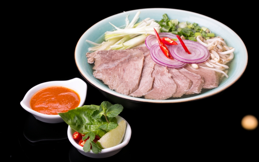 За меню отвечает выписанный с родины шеф Хи Ле Ньгуен с командой. По его словам, в заведении — северо-вьетнамская кухня: она менее острая, чем гастрономия юга страны. Заглавный суп фо бо, который можно взять объемом в литр или в его половину, можно острее делать самостоятельно — к нему выдают плошку с чили-соусом. Так же, отдельно, дают травы, добавлять их в суп обязательно — мята, базилик и кинза здорово освежают пряный бульон, который варят восемь часов. Экзотичности любому блюду тоже можно сообщить самостоятельно — присовокупив к нему национальный рыбный соус, который на каждый стол ставят вместе с соевым. Фирменным блюдом на компанию предлагают лау — кипящий бульон над горелкой, в которым ты сам готовишь мясо, морепродукты или овощи, такая азиатская альтернатива швейцарскому фондю, уходящая историей к пище вьетнамских кочевников. Шеф-повар явно готов экспериментировать — скажем, делать бургеры с шиитаки или со свининой на гриле, но иногда его решения слишком уж неожиданные: если блинчики немы с курицей — отличные, то в тех, что с морепродуктами, неожиданно обнаружатся банан и монструозная панировка.