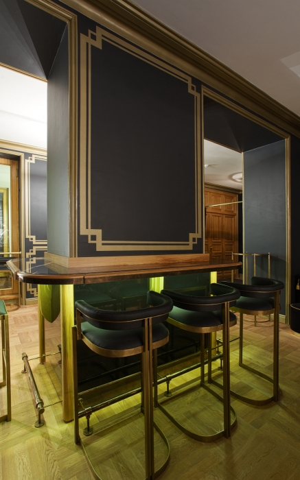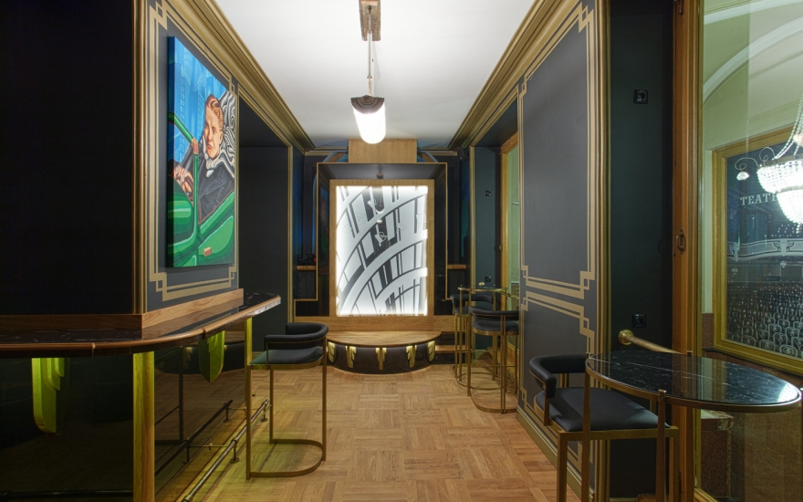 Интерьер: Дизайн придумал Валерий Ларионов, автор интерьера ресторана «Место»: много черного и золота, барная стойка стилизована под сцену, высокие кресла с латунным каркасом выполнили по нашим эскизам в интерьерной студии Rooma.