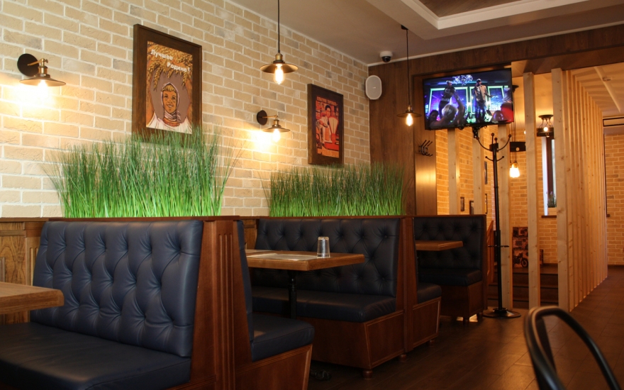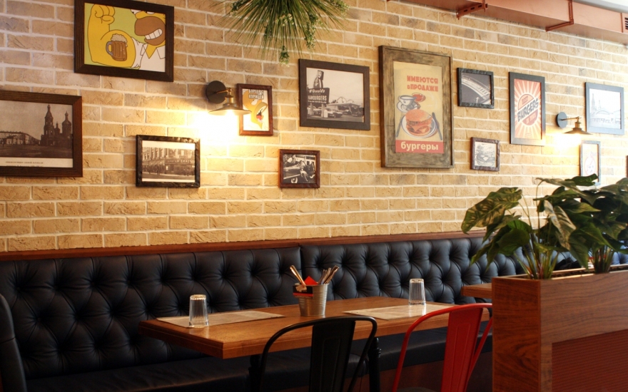 Интерьер: Машинерия открытого гриля, сверкающего своими решетками и колесами, уравновешена деревом, мрамором и трогательными мелочами: деревянной скамьей как в городских парках, шкалой для измерения роста или сотами из плитки. Сумев ангажировать знатного каллиграфа Покраса Лампаса, его урбанистическими росписями не стали покрывать весь зал, а отвели всего две стены: как раз для настроения, но чтобы не угнетать лишней брутальностью.
