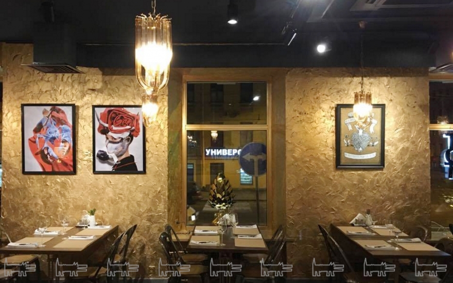 Соединять арт с общепитом — мировая практика: в баре запросто может быть библиотека, а в кофейне — фотовыставка. В Петербурге к междисциплинарному проекту ресторана и галереи владелец Владимир Любомиров привлек Леонида Алексеева — дизайнер спродюсировал как интерьер самого пространства, так и экспозицию начинающих авторов в нем. Нет смысла скрывать, что автор этой статьи с Леонидом — родственнники, так что я лицо заинтересованное. Скажу только, что у меня похолодело на душе, когда я узнала, что зовут не в голые стены, а стены, уже заданные предыдущим оформителем — внимание: золотые, в попугаях и ультрамариновые. В нагрузку к этому еще навесить современного арта?