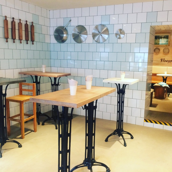 Для завершения ностальгической картины поставили столы-гвоздики и установили сверхдемократичные цены: пышку отдают по 17 рублей, кофе — по 35. Наб. кан. Грибоедова, 56–58