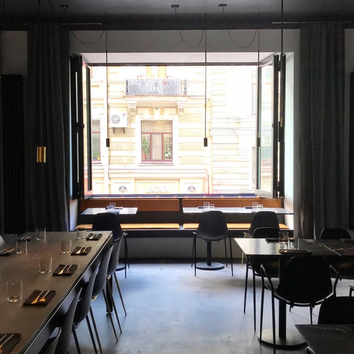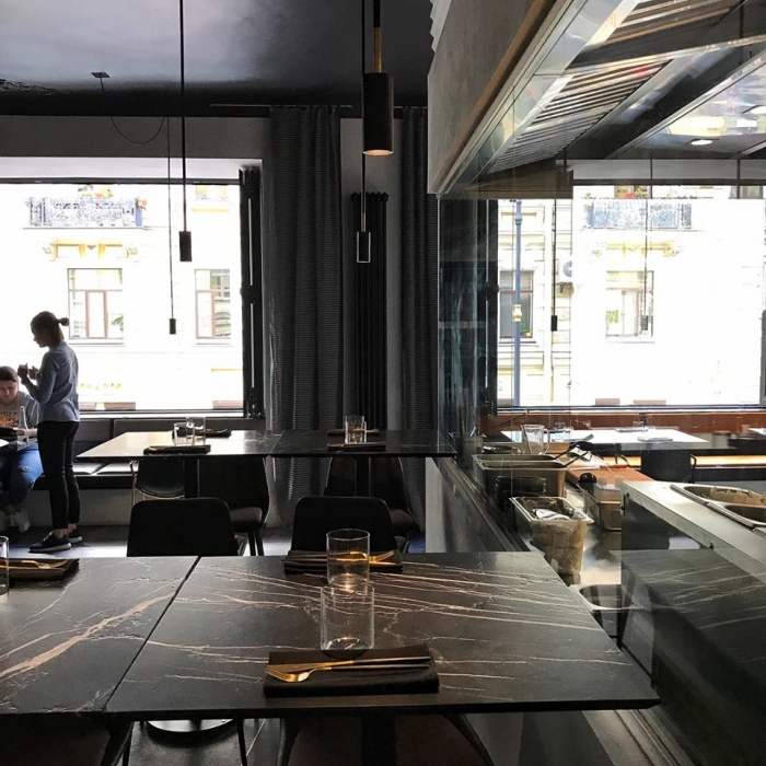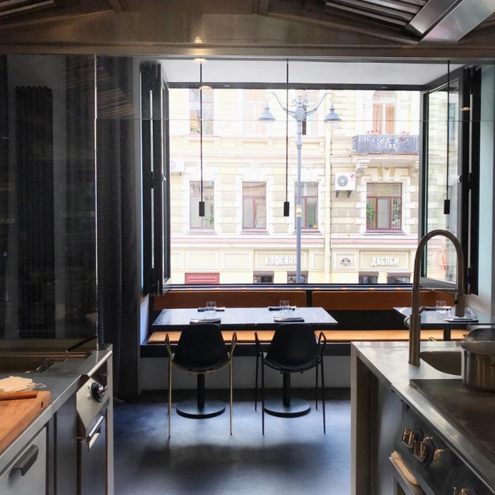 Дальше сплошная лирика. Прохлада черного мрамора столешницы и теплое золото приборов. Самурайская лаконичность полотен калиграфа Покраса Лампаса и ажур балконной решетки в доме Крундешева напротив. Свежесть петербургского городского бриза из распахнутых окон и дышащая паром открытая кухня. Залитые хирургически-ослепительным светом пластические этюды труппы поваров и густой полумрак зрительного зала, скрадывающий все остальное. Приходите, берите программкой сложенное меню и садитесь: первый звонок в 18.00.