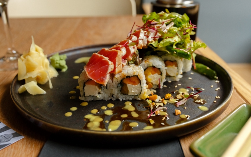 Меню: Основа меню — азиатская кухня, за основу которой взяли японскую. Страница с фирменными роллами делится на четыре части: каждая подразумевает особый способ готовки. Или неготовки: раздел «Тартар ролл» предлагает нарезанных каноническим кубиком сырого тунца, лосося или гребешка. Раздел «Татаки ролл» содержит обжаренных или опаленных палтуса, тунца и лосося. «Кранчи ролл» — теплые роллы с крабом, или тунцом, или лососем с угрем, мгновенно прихваченные во фритюре целиком и потом порезанные на части. В раздел «Спешл ролл» включены небезызвестные «Филадельфия» и «Калифорния», а еще ролл с лососем и угрем. Порции гигантские, и за аутеникой не гонятся.