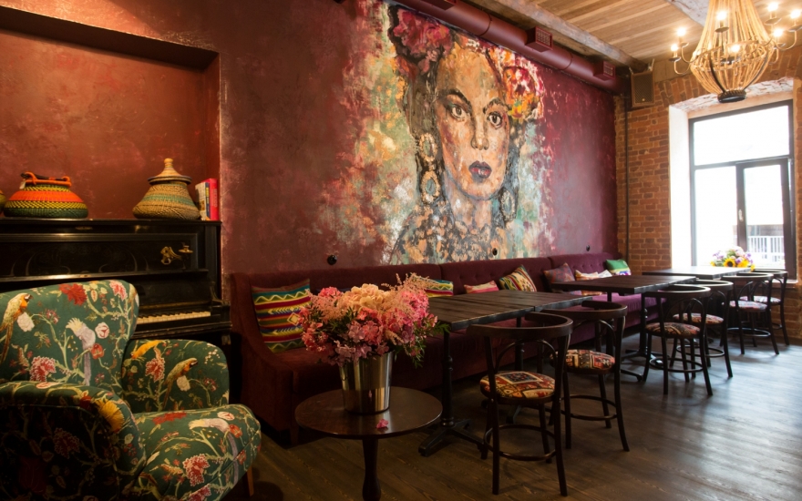 Интерьер: Дизайн сделала Ксения Смирнова — в городе ее знают в том числе по оформлению заведения Una. Все делали по вдохновению, стены расписал отец Ксении — опытный художник.