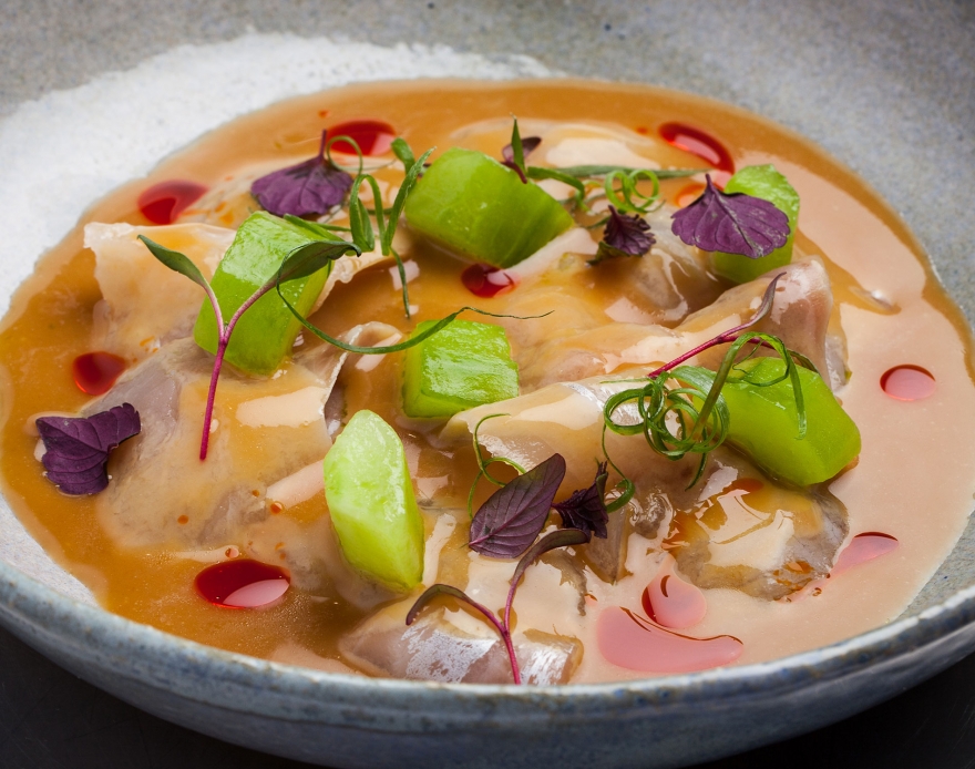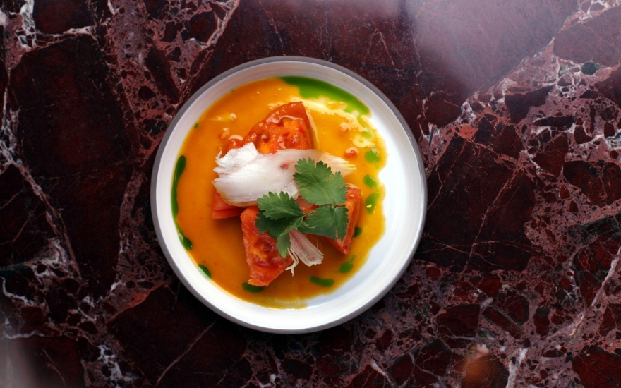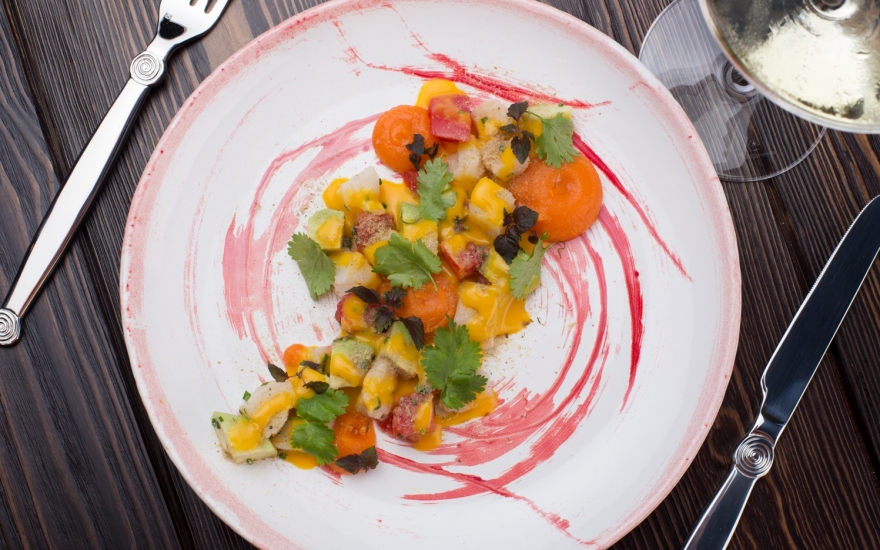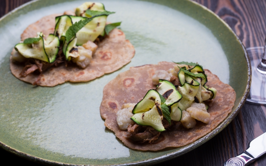 Меню: Кулинарные традиции Мексики, Перу и Чили шеф-повар Евгений Викентьев трактовал по-своему, но использовал все принятые там техники: быстрое маринование, использование углей и открытого огня — прижигание пламенем или раскаленным маслом.Так в меню появились жженое тирадито — разновидность севиче — из лангустина с прозрачной сангритой, кинзой и томатом, тако из гречневой тортильи с уткой, бананом, цукини и кардамоном и кукурузное крем-брюле с какао-мороженым, соленой шоколадной землей и кориандром.