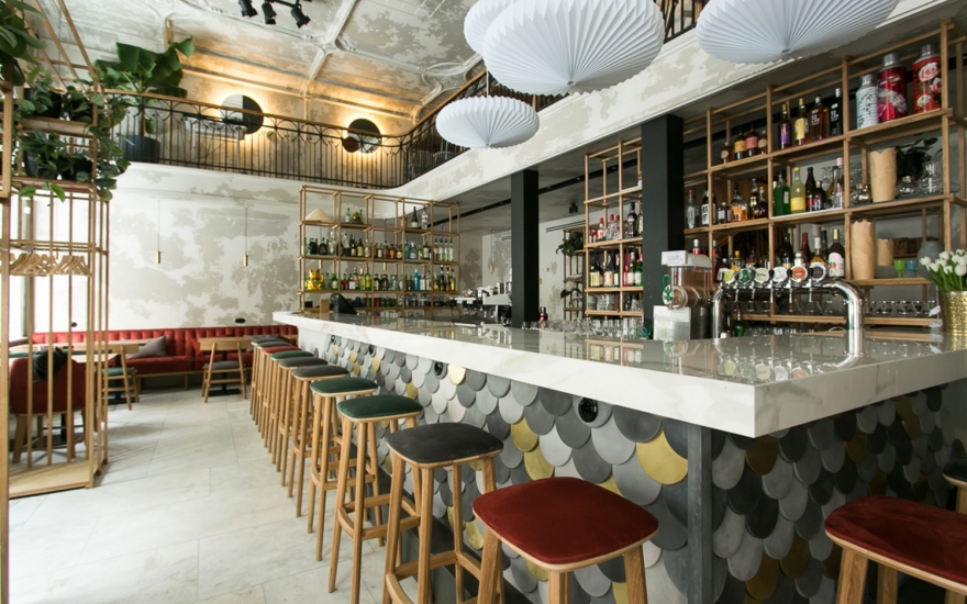 Интерьер: За строгими арками окон здания страхового общества «Россия» 1905-1907 годов тех, кто налегает на коктейль Oh My Mao на китайской водке, поддерживают модерновые перила родной зданию консоли. Место планирует быть препатийным центром Адмиралтейского района — для этого предусмотрены диджейский пульт под потолком и большая барная стойка.