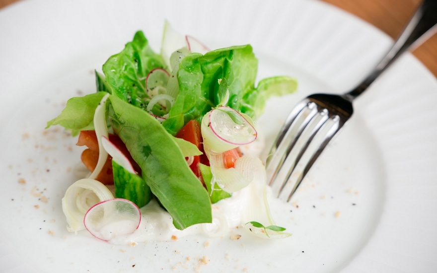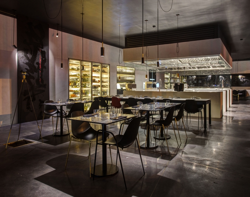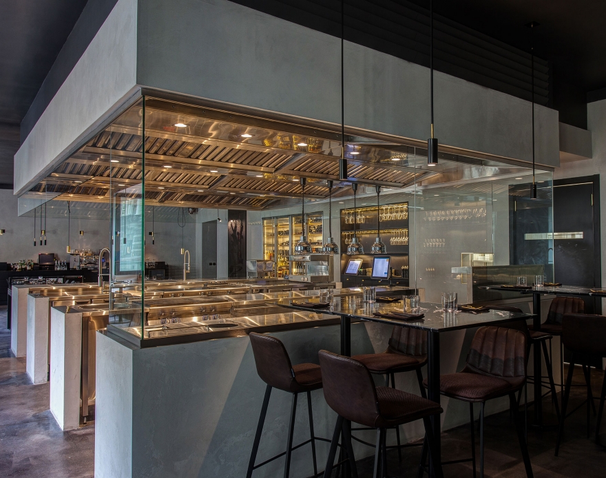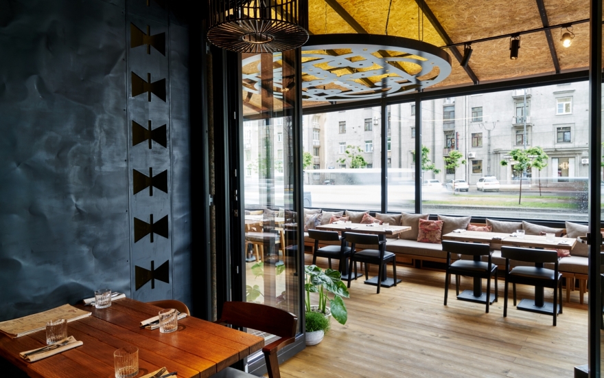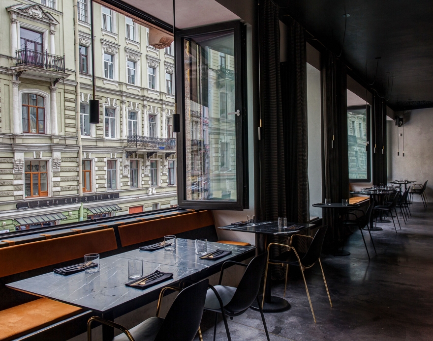 Интерьер: Лаконичная обстановка берет акцентами: читается прохлада черного мрамора столешницы и теплое золото приборов. Самурайская минималистичность полотен калиграфа Покраса Лампаса и ажур балконной решетки в доме Крундешева напротив. Свежесть петербургского городского бриза из распахнутых окон и дышащая паром открытая кухня. Залитые хирургически-ослепительным светом пластические этюды труппы поваров и густой полумрак зрительного зала, скрадывающий все остальное.