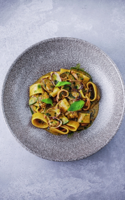 4. Каламарата с вонголе — простая, но образцовая паста. У Арслана и Татьяны в портфолио — многолетняя работа в Four Seasons, у Александра — в W: только в пятизвездочных отелях можно так набить руку на итальянской классике.