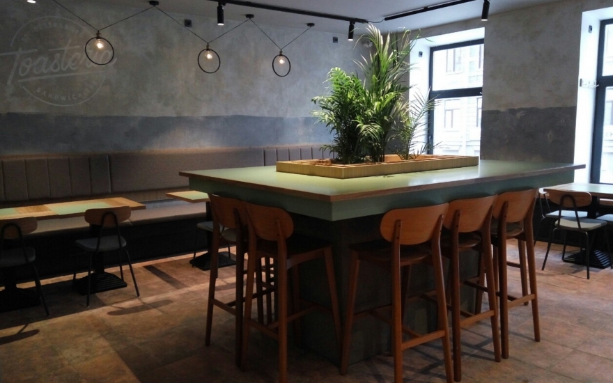 Интерьер Toasteria придумали в бюро Kapodaki, в портфолио которого «Бекицер» и Social Club. В центре зала в цветах скандинавской колористики — высокий общий стол; всего заведение рассчитано на четыре десятка посадочных мест. Пока место работает в тестовом режиме в формате бара — то есть только наливают и сервируют холодные закуски, с 9 февраля оно начнет работать в полную силу.